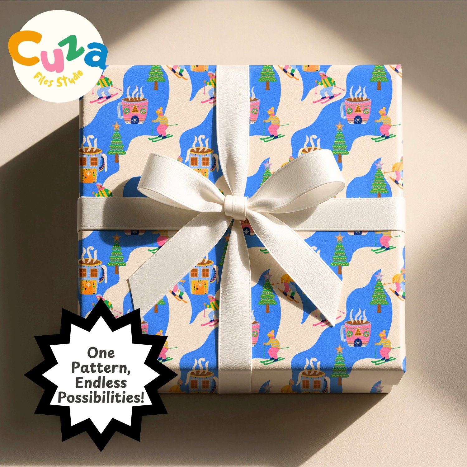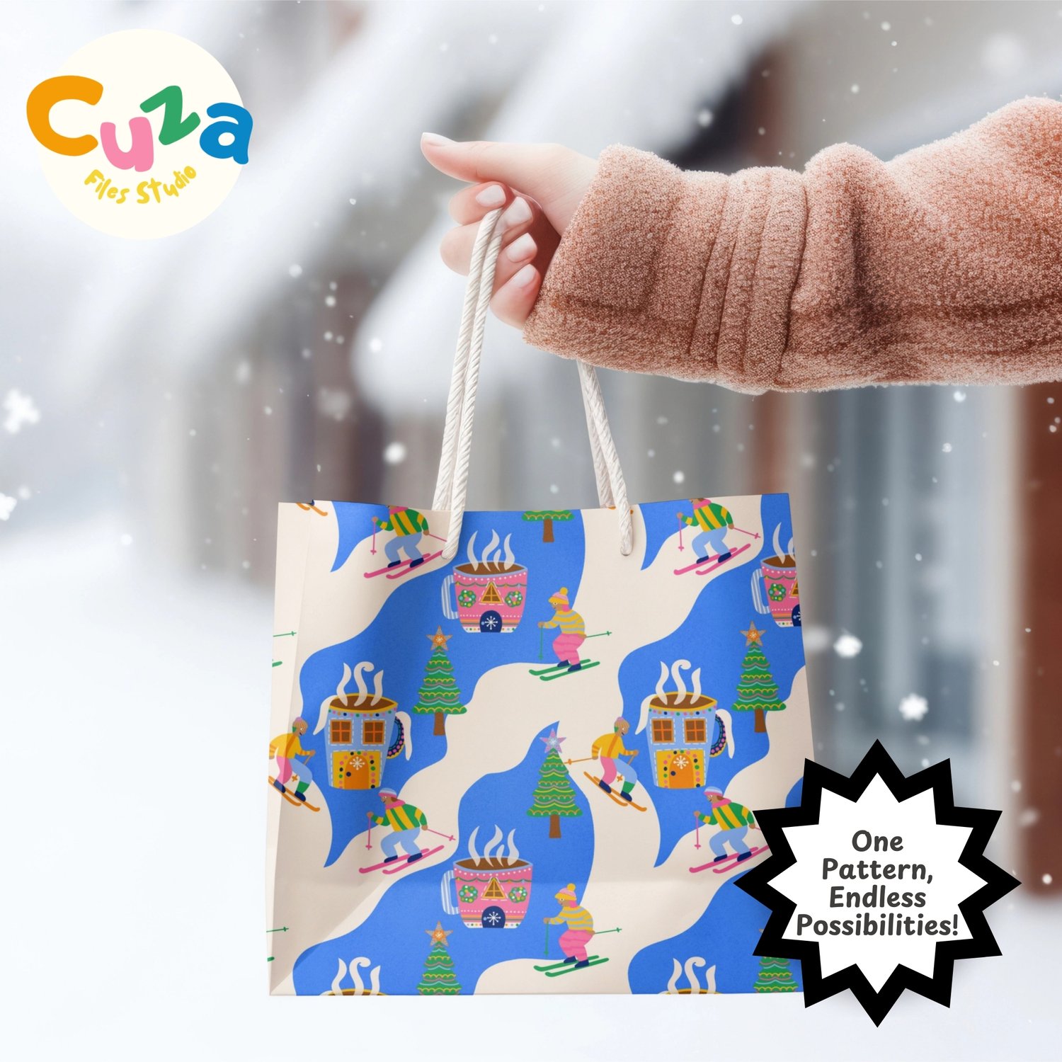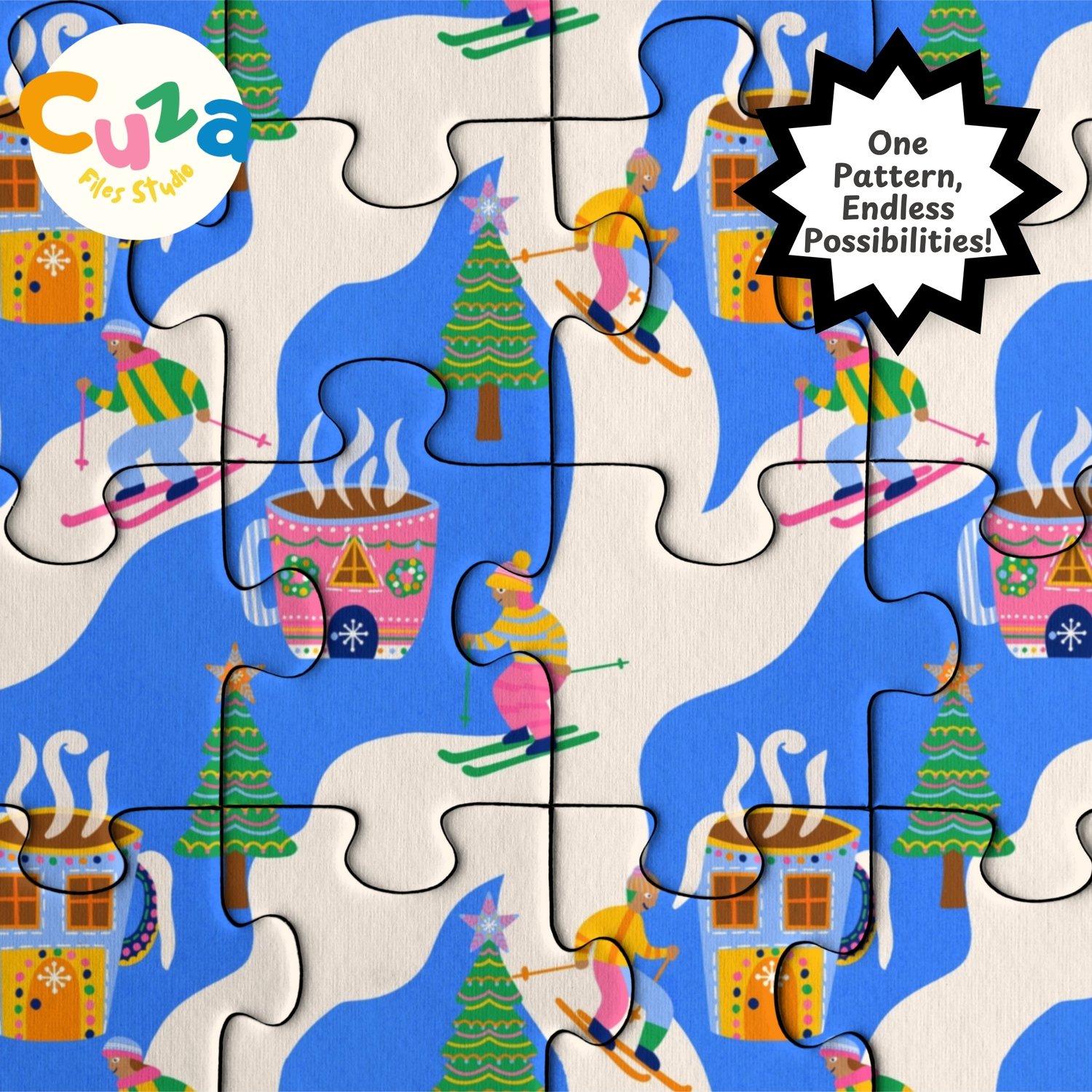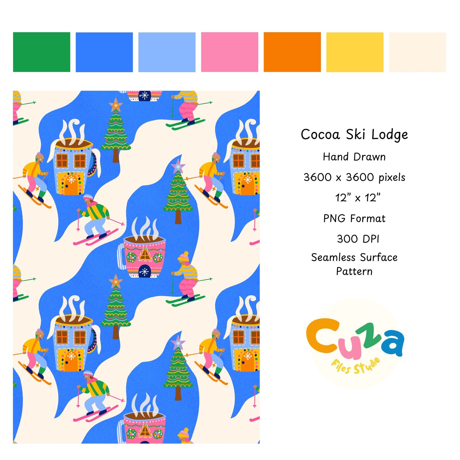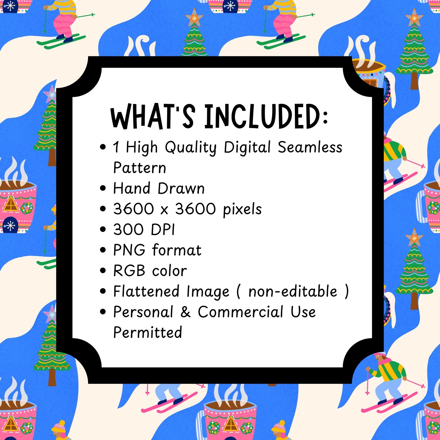 My playful pattern combines nostalgic christmas skiing with a beloved hot cocoa making it perfect for projects that celebrate the fun side of the holidays and bring a joyful feel that kids and adults will love.