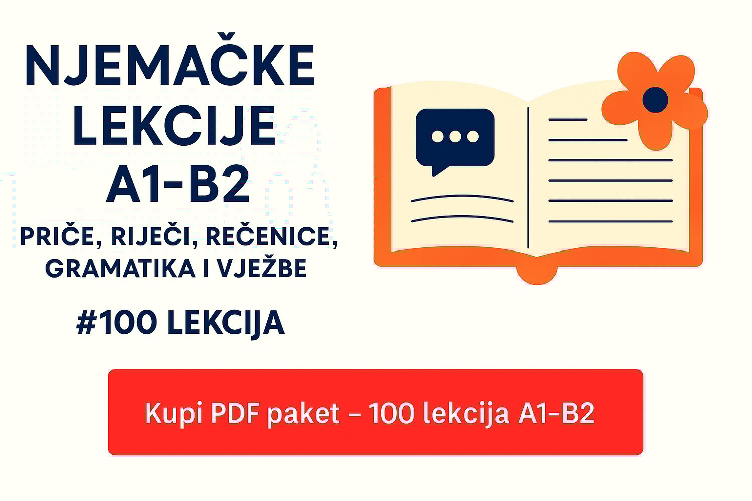 Sveobuhvatan PDF paket za učenje njemačkog jezika od početnog do srednjeg nivoa (A1–B2). Sadrži 100 pažljivo strukturiranih lekcija koje kombinuju priče, vokabular, rečenice, gramatiku, dijaloge i vježbe — idealno za samostalno učenje, učitelje i edukativne kreatore.