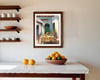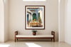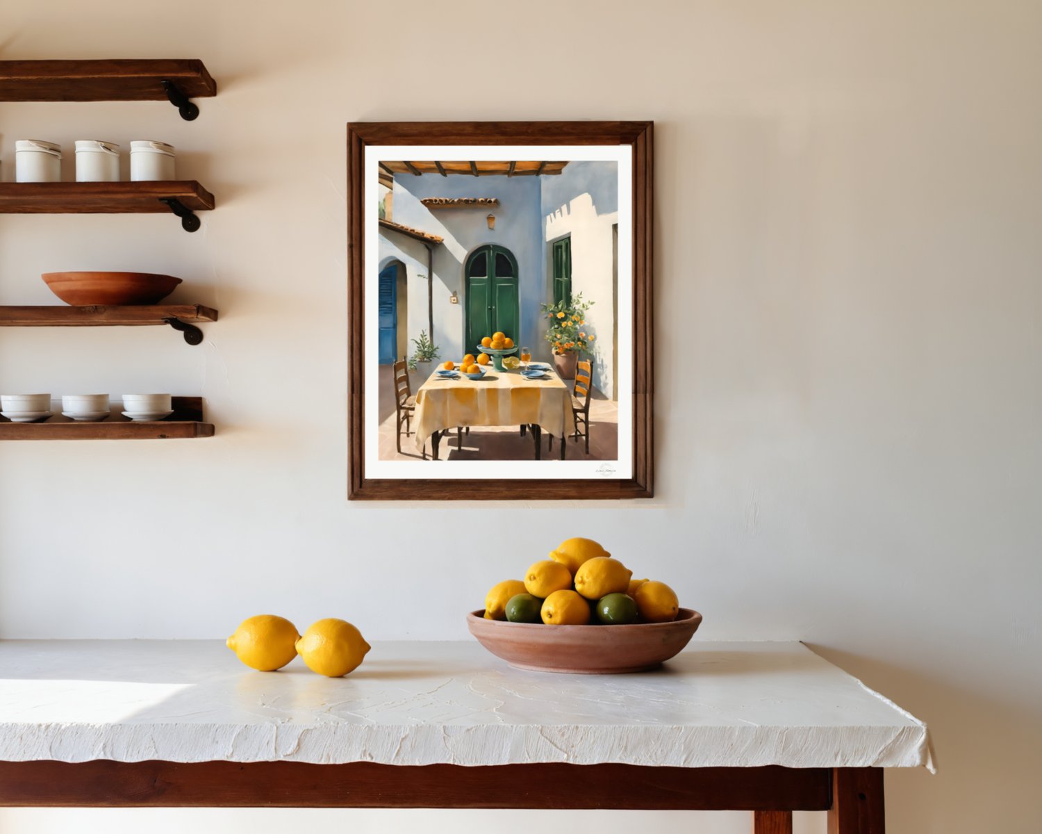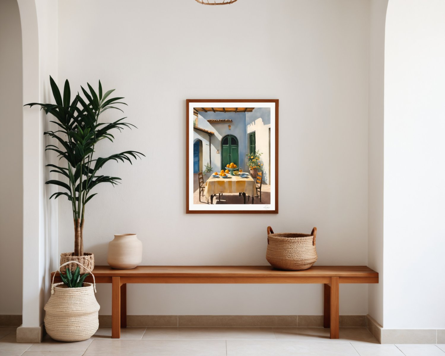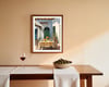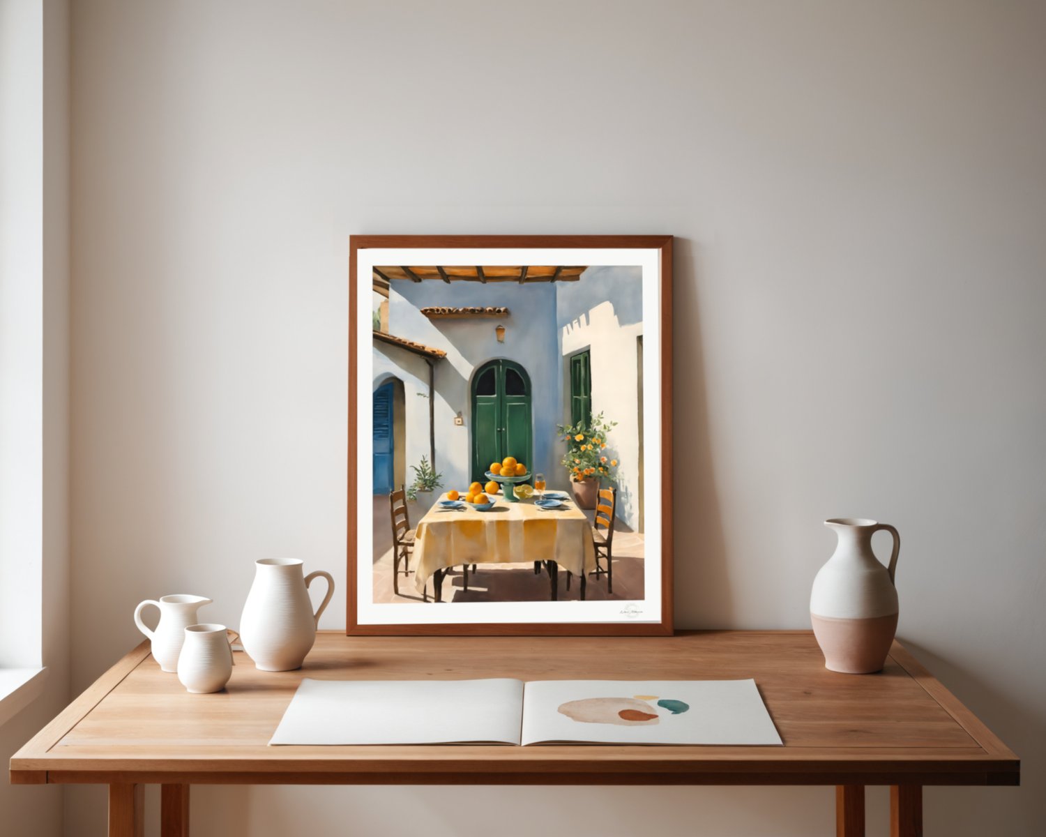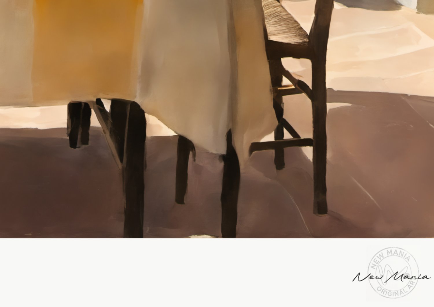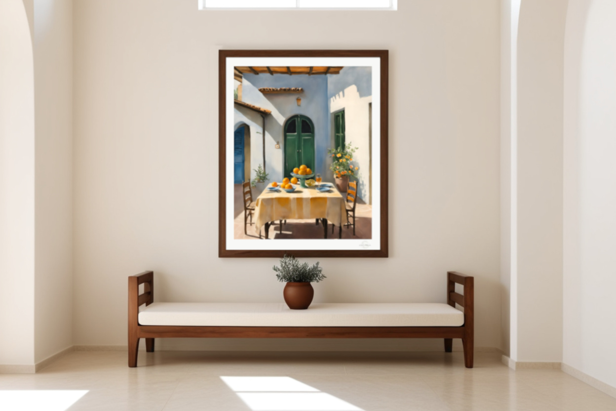 A warm and inviting courtyard scene with soft sunlight, natural tones, and a relaxed outdoor setting. This artwork brings a calm and welcoming atmosphere to any space.