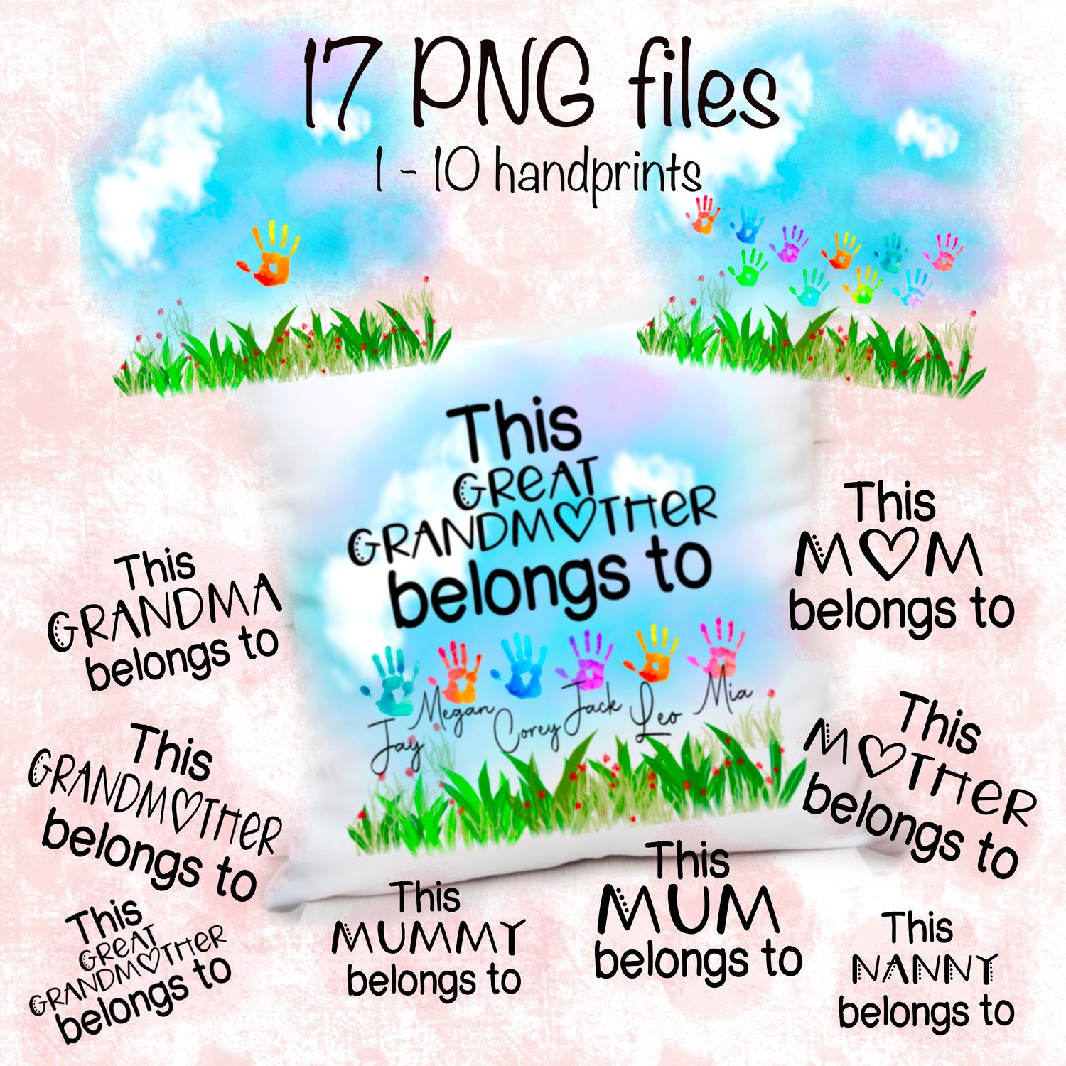 Mother’s Day design featuring 1-10 handprints. Text files to include, “This Mum, Mummy, Mother, Mom, Nanny, Nannie, Grandmother, Great-Grandmother etc, belongs to”