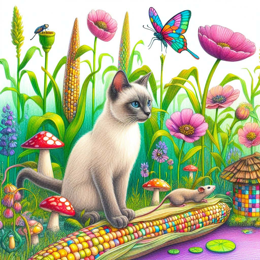 Beautiful Siamese Cat in a cornfield with a colourful wishing well, mice & butterflies.