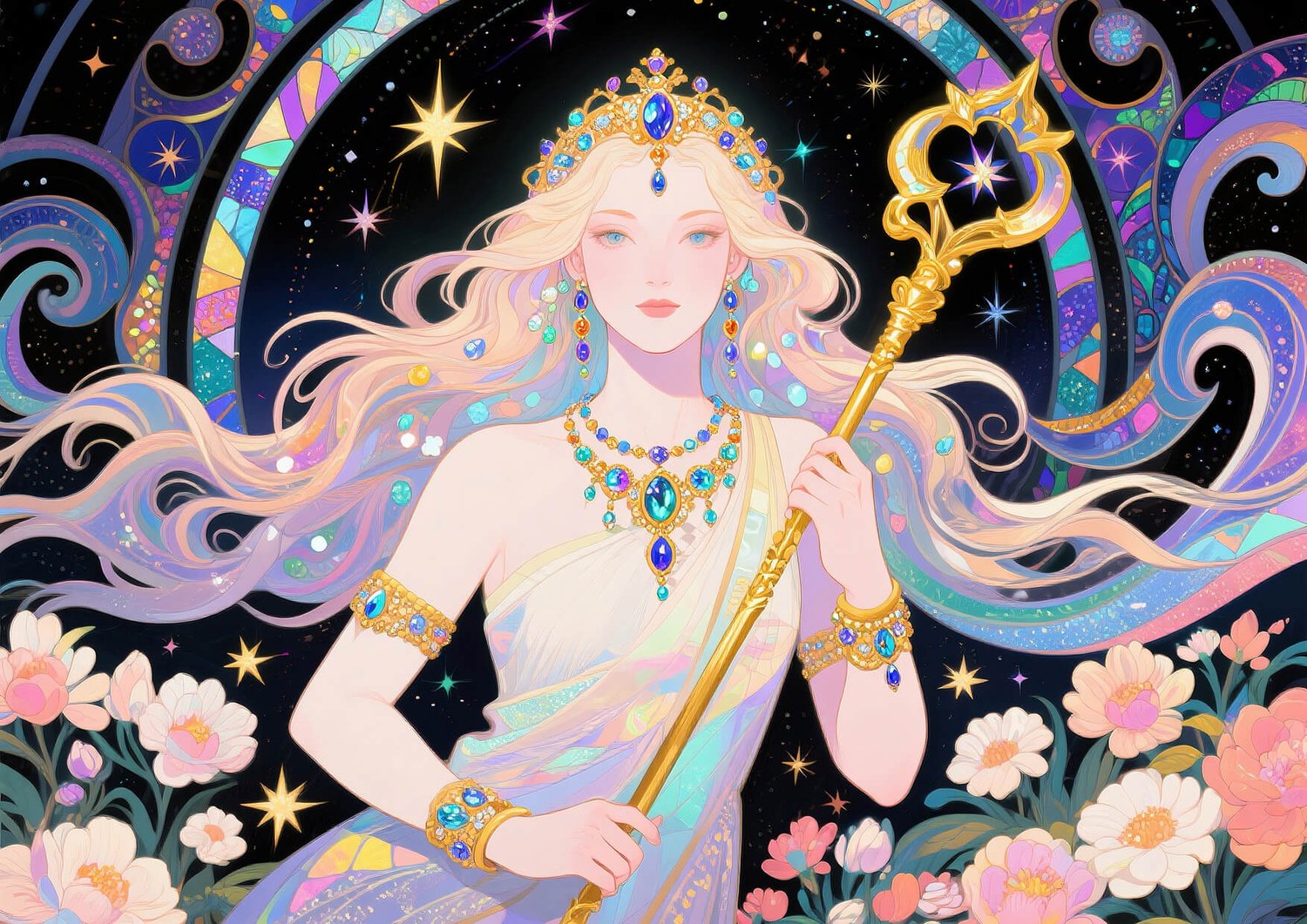 A beautiful angel with flowing hair, sparkling jewels, and a noble golden staff appears in a magical scene surrounded by blooming flowers, shimmering stars, cosmic waves, swirling patterns, and luxurious celestial motifs.