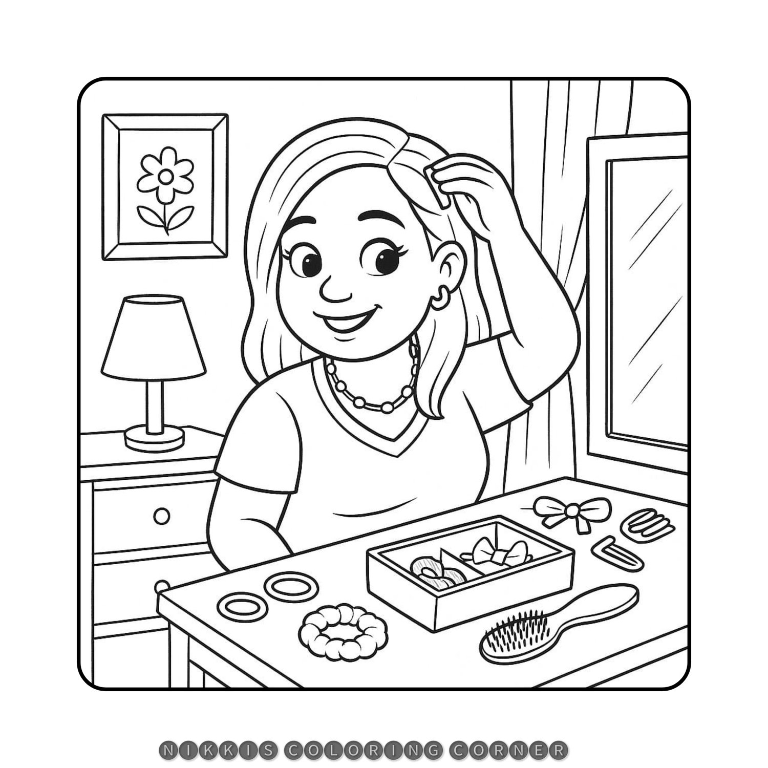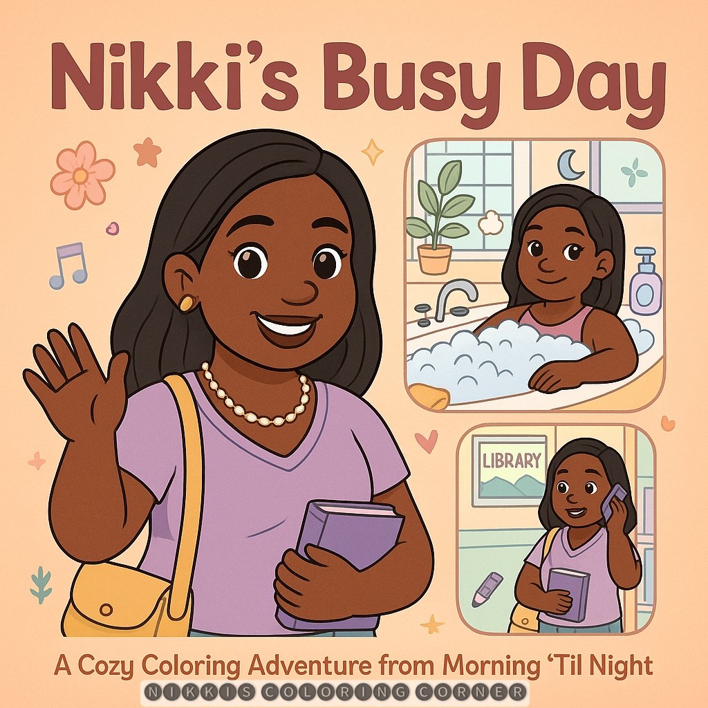 🌿 Unwind, get creative, and bring Nikki’s busy day to life — one coloring page at a time! 🌿