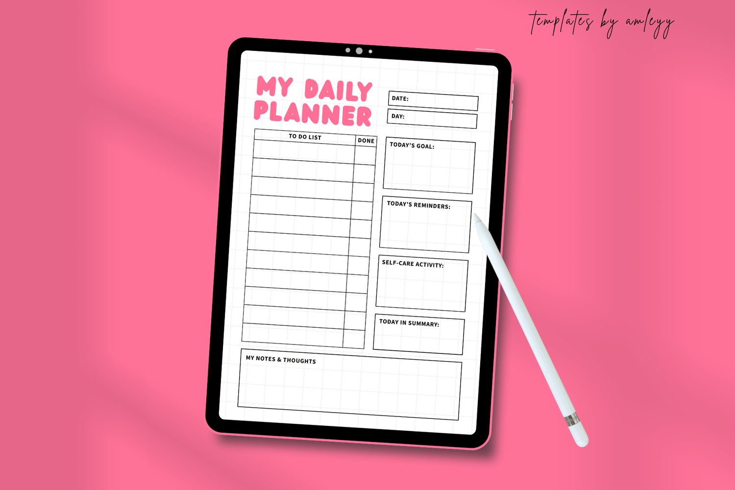 Organize your priorities, set goals, plan your day, and track self-care with dedicated sections for a complete productivity boost. Whether you're using a digital tablet or printing your planner, this versatile undated template is easy to personalize in Canva — no design experience needed.