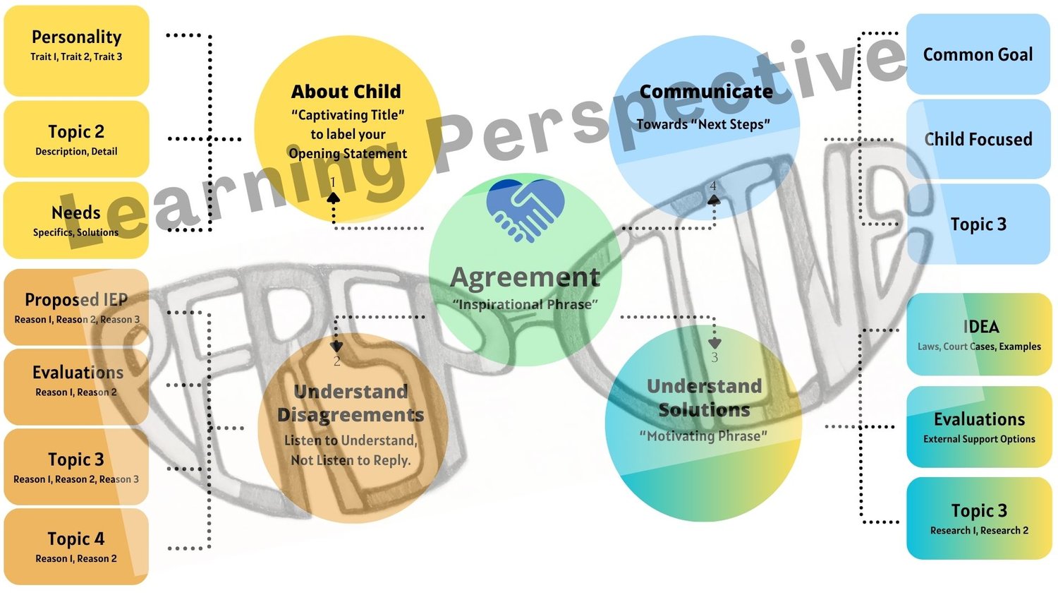 As seen on Learning Perspective YouTube channel, download the full Opening Statement For Mediation mind mapping structure to envision how to research and write your opening statement for mediation. A strong effective opening statement full of facts is crucial to keep the focus on your child's needs, advocate towards collaboration, and motivate for all to have a successful outcome together.