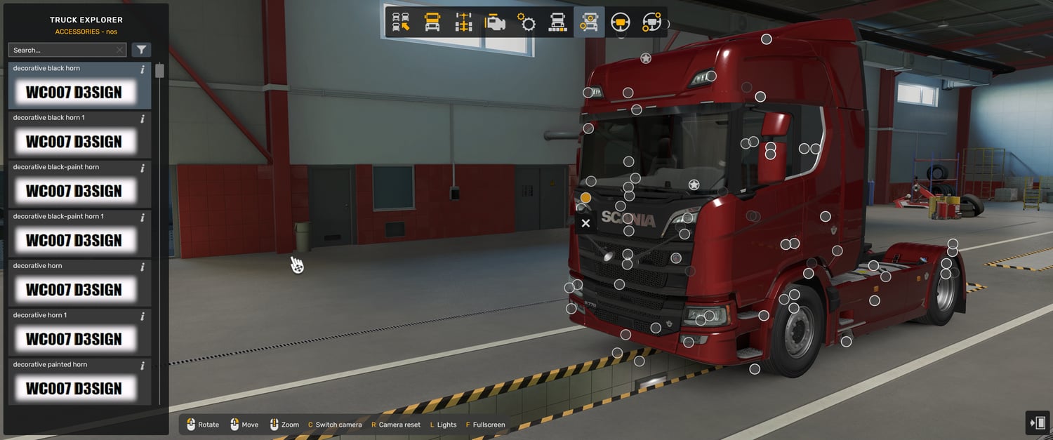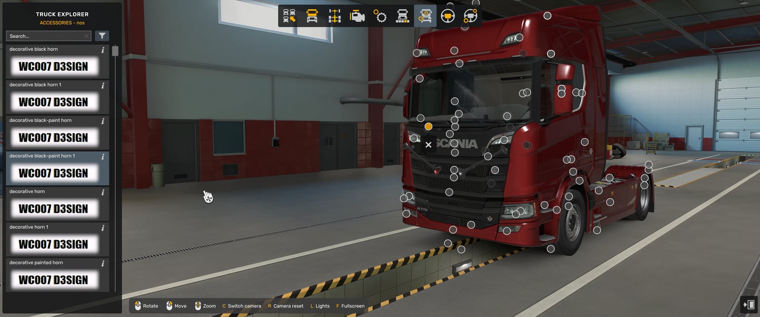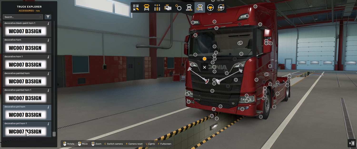 Scania NG decorative horns works only with new scania no spoiler mod (1.58 version), not work with V1 version and Base game Scania truck