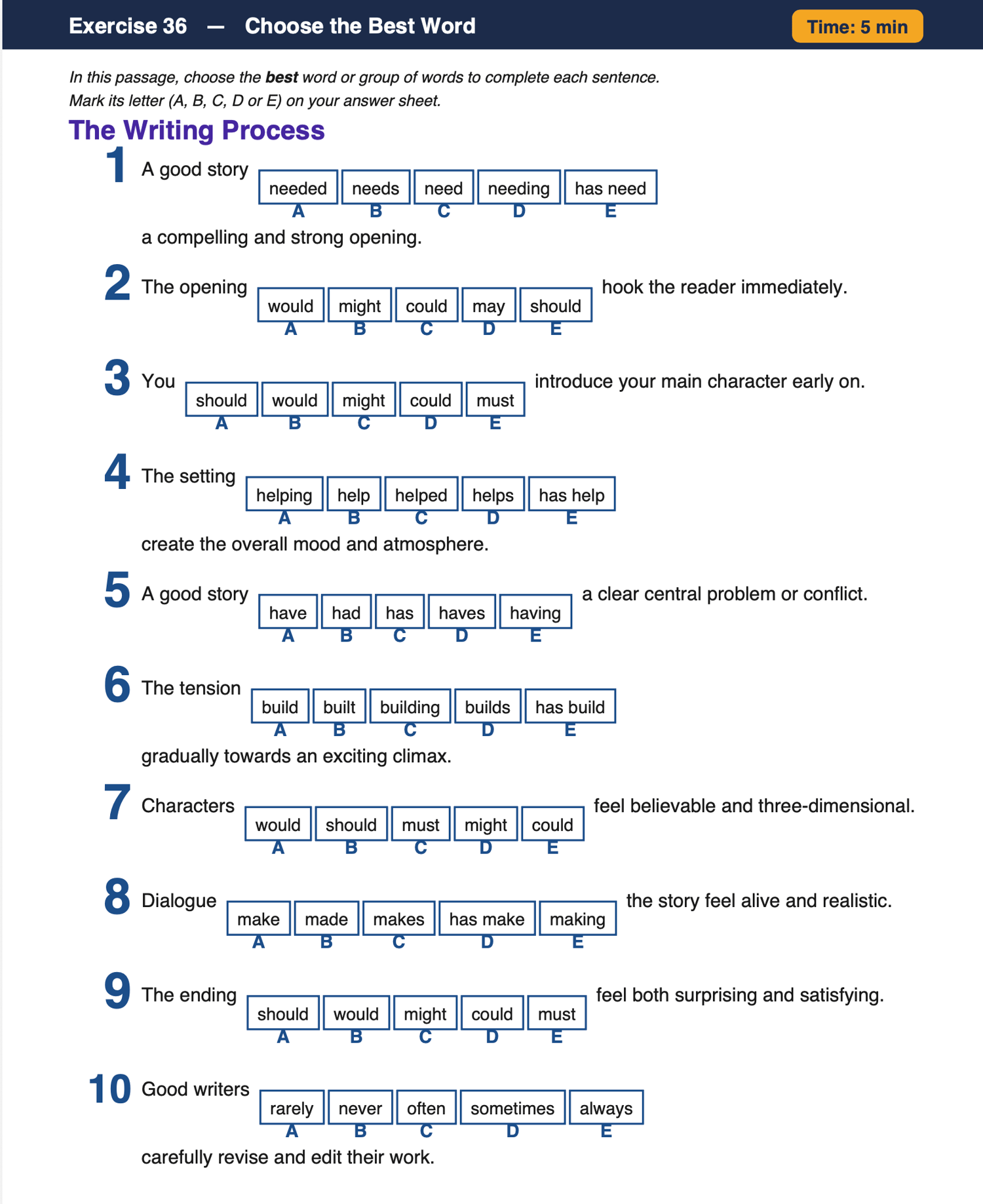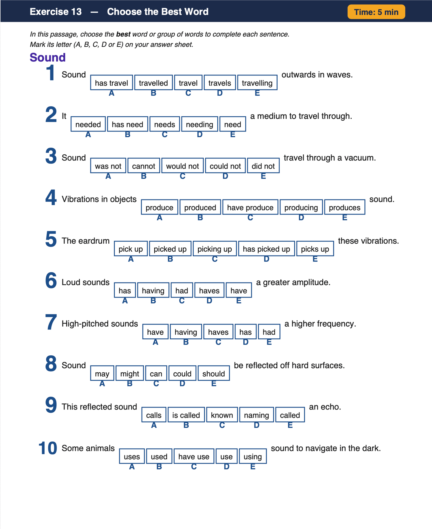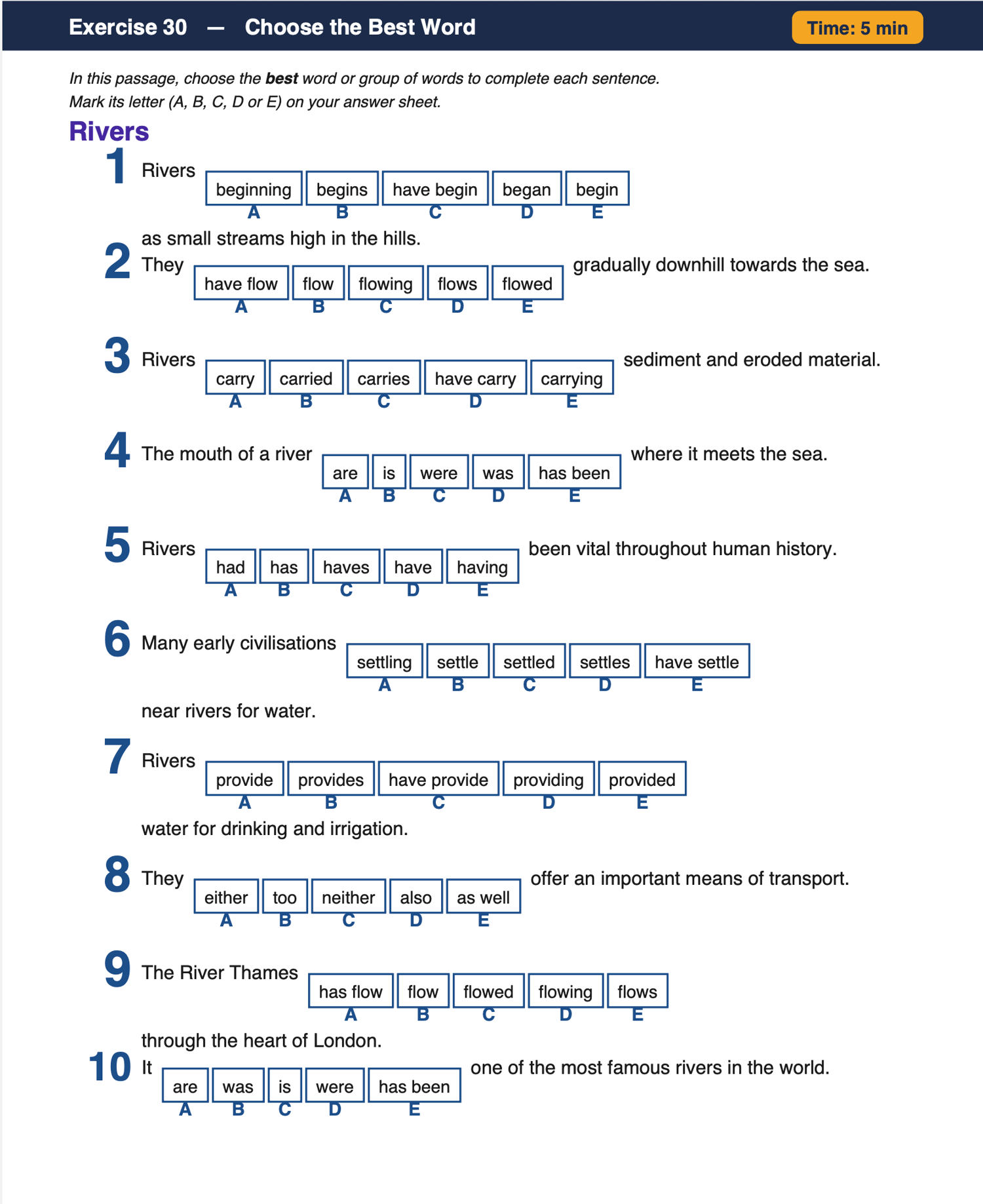 How it works: Each exercise presents 10 sentences with a gap, and pupils must select the grammatically correct and contextually best word or phrase to complete the sentence. Topics test a range of grammar skills including verb tense, subject-verb agreement, modal verbs, relative pronouns, and more.