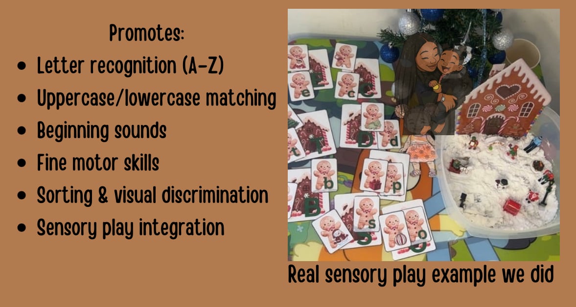 Your toddler gets to match each gingerbread man to the correct gingerbread home, turning literacy practice into a hands-on, engaging, play-based experience. Perfect for holiday learning, literacy centers, sensory bins, or everyday alphabet fun.