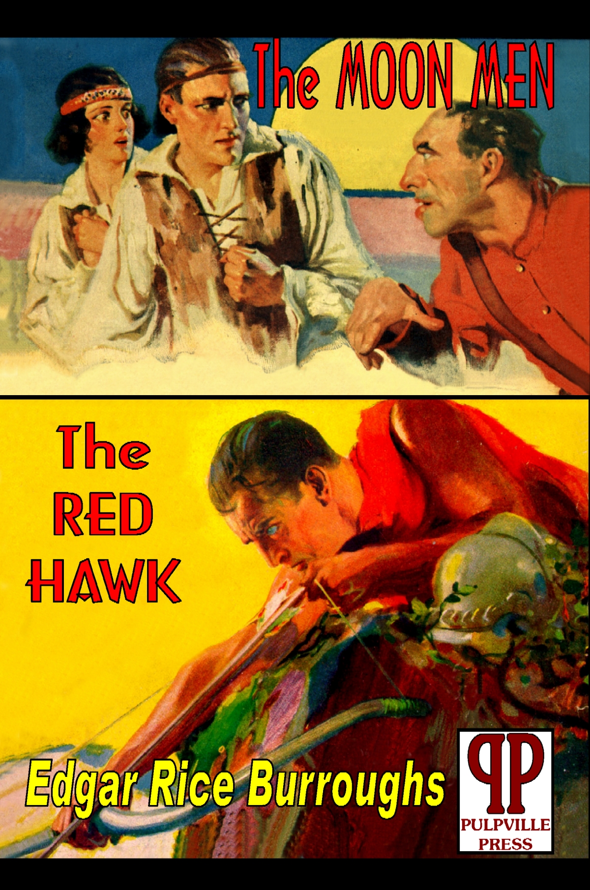 "The Moon Men" is the story of Julian 9th, who lived in the ruins of Chicago in the 22nd century, after the Kalkars from the moon had conquered the Earth. "The Red Hawk" takes place 500 years from now. The Red Hawk (Julian the 20th) is the leader of the proud, desert-bred Yanks. The spear, the sword, and the bow and arrow are the weapons of this time. Thrilling sequels to "The Moon Maid".