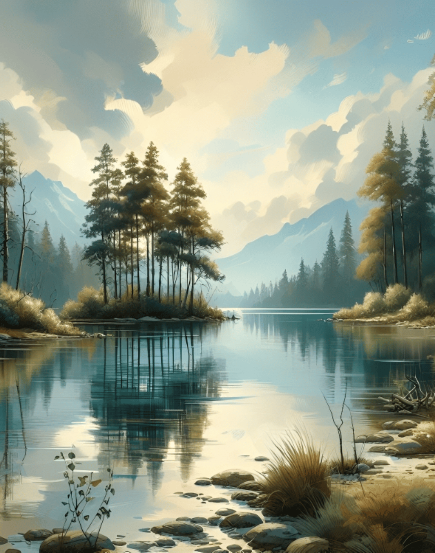 Serene Lake Painting, Lake landscape, Dusk, Vintage Landscape, Nostalgic Nature, Cool Nature, Rustic natural Landscape, Painting.