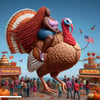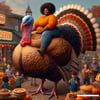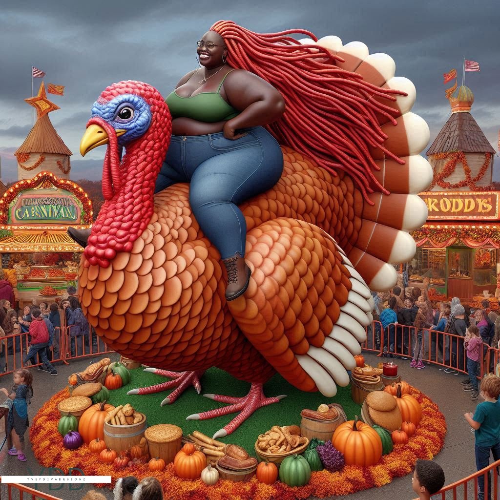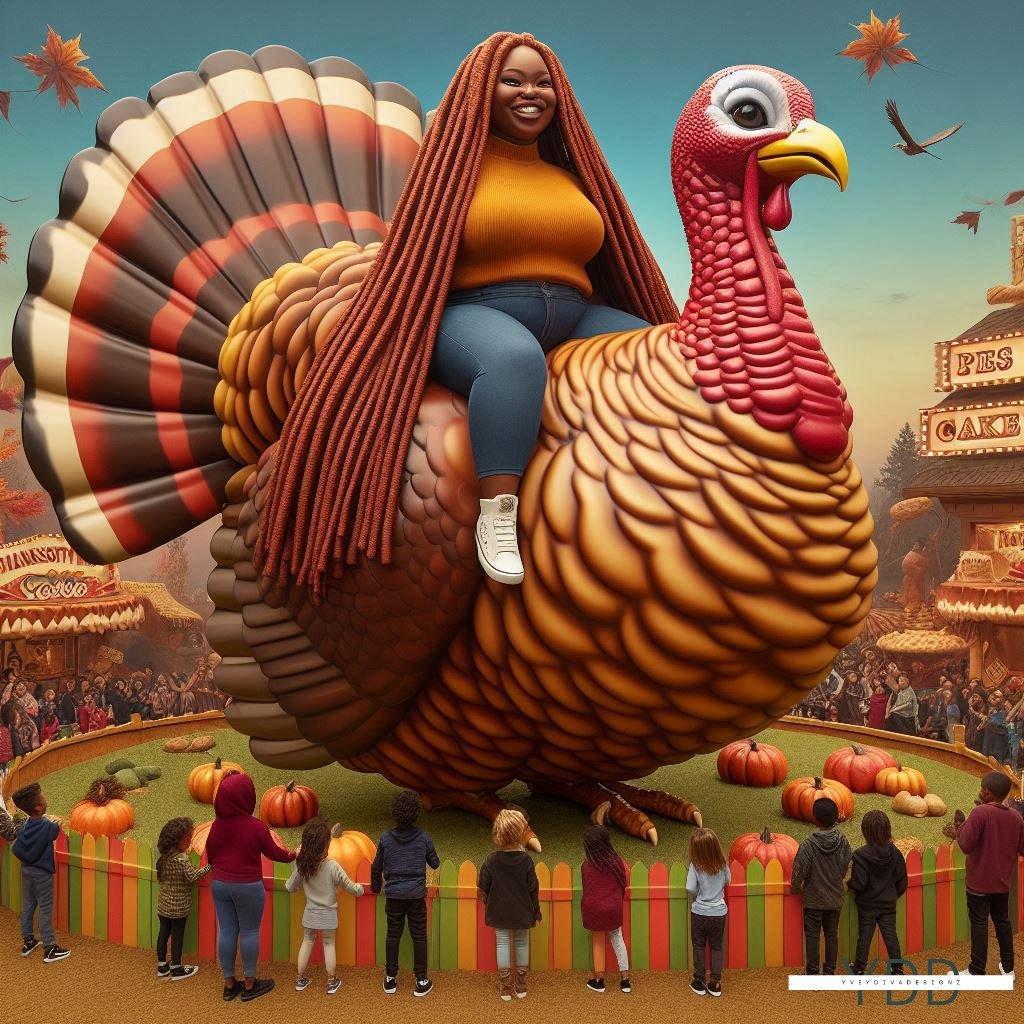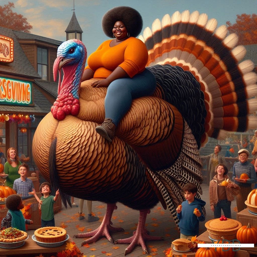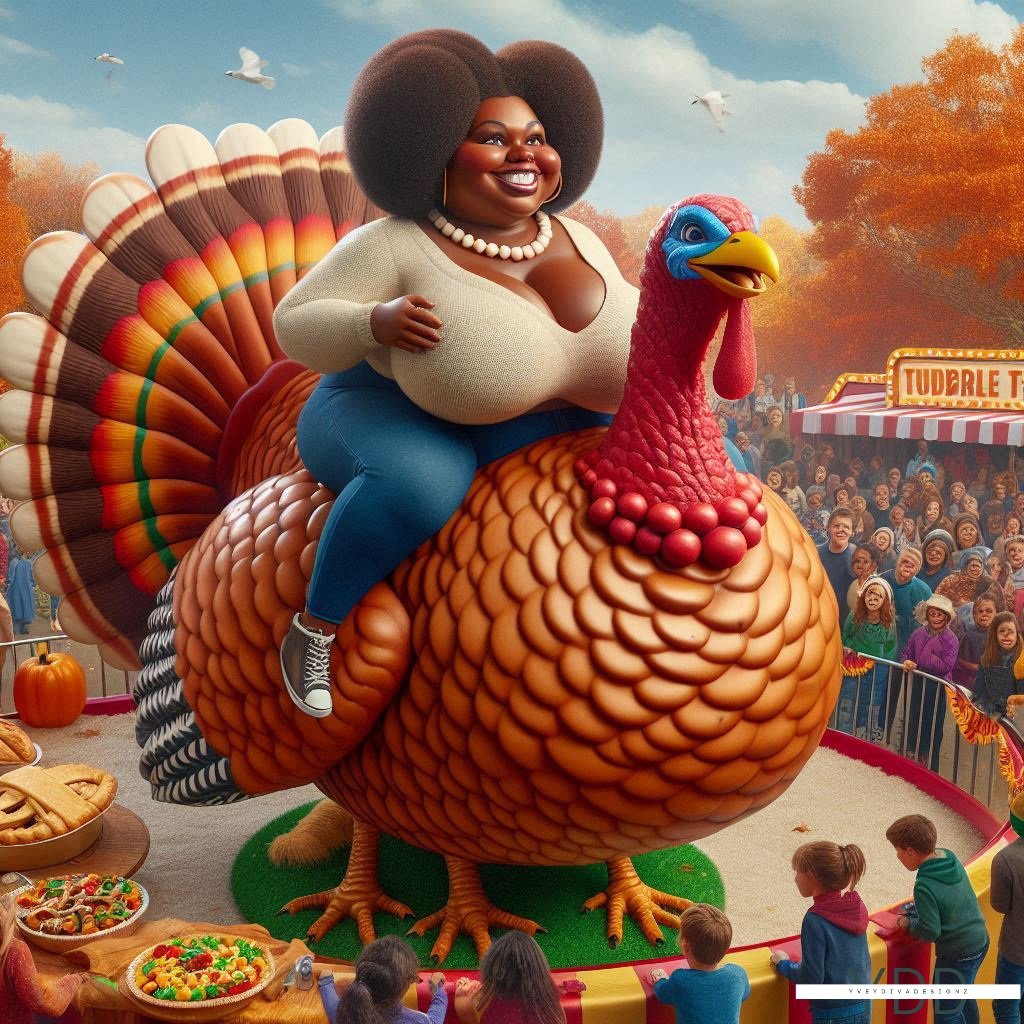 A jubilant, full-figured woman, with contagious laughter and spirit, rides atop an enormous, majestic turkey, capturing the heart of the autumn festival. Her larger-than-life ride symbolizes freedom and self-love—a reminder that true celebration means embracing every part of oneself.