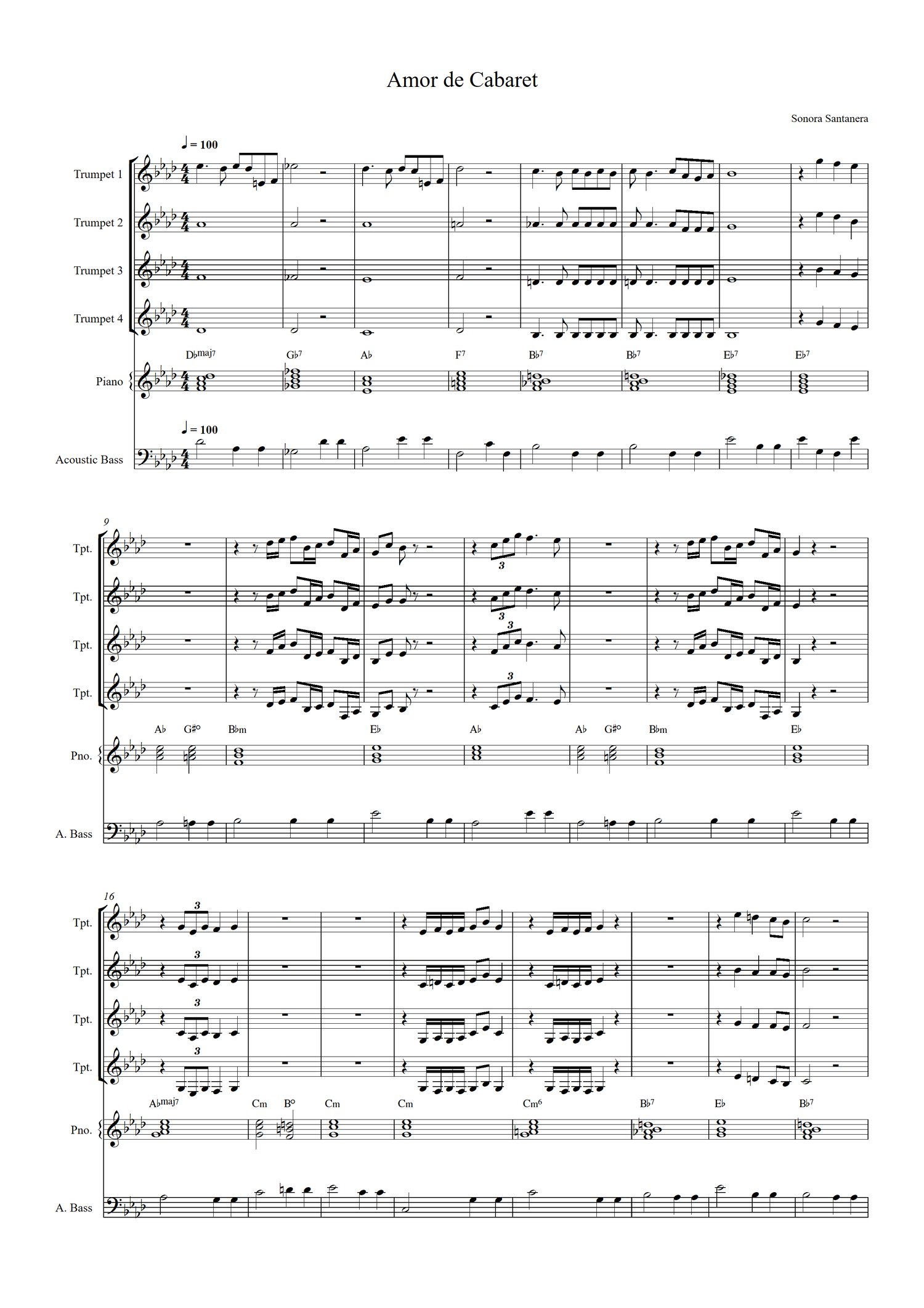 Partitura de la canción (Amor de Cabaret - Sonora Santanera) Para Trompeta 1, 2, 3, 4, Piano y Bajo (Acústico)