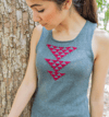 Connected is a bottom-up, seamed sleeveless top, featuring a colorwork motif on the front and back of the garment. The two pieces are worked separately, seamed together, then a I-Cord BO hem is worked around.