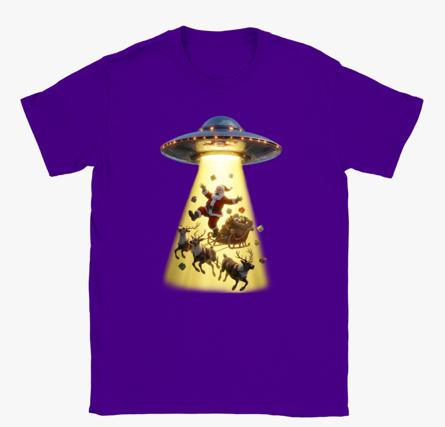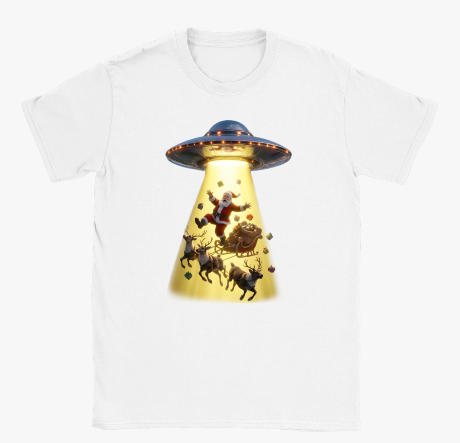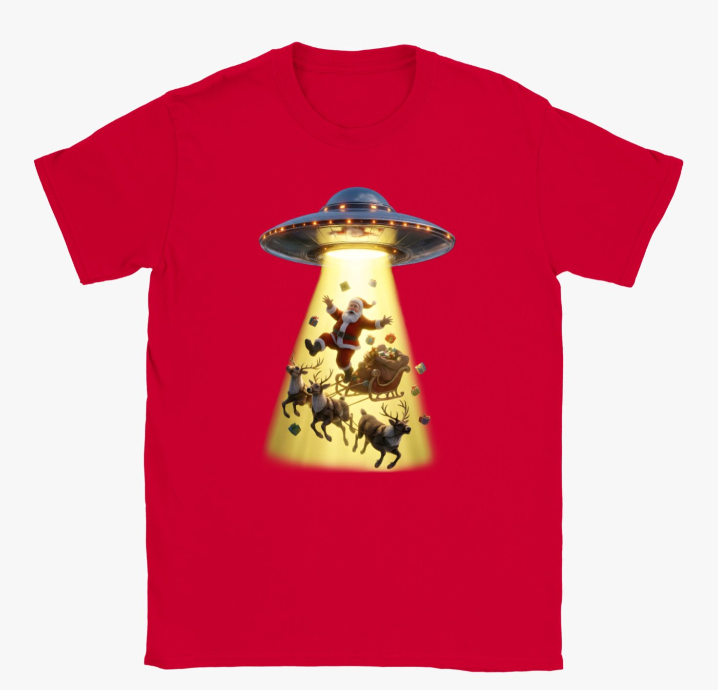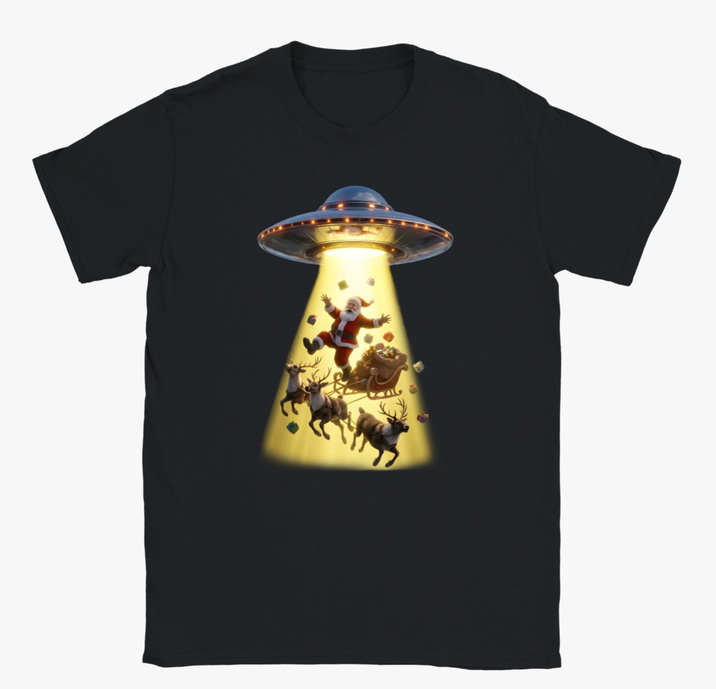 This playful holiday t-shirt features a hilarious scene of Santa Claus being beamed up by a UFO, complete with his reindeer, sleigh, and scattered presents caught in the glowing tractor beam. With bright colours, detailed artwork, and a fun sci-fi twist on Christmas tradition, this design is perfect for anyone who loves festive humour, quirky graphics, and standout seasonal wear. A great gift for Christmas lovers and UFO enthusiasts alike.