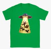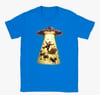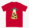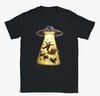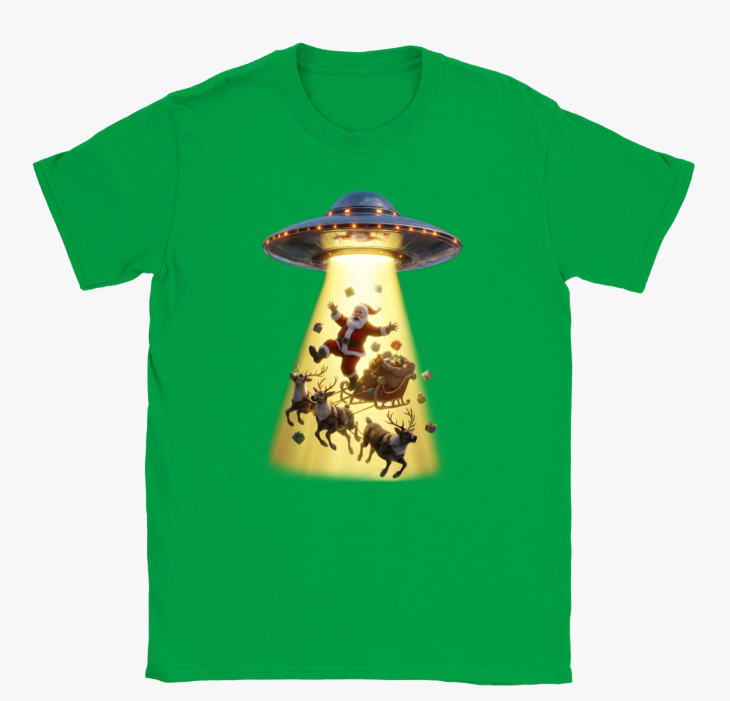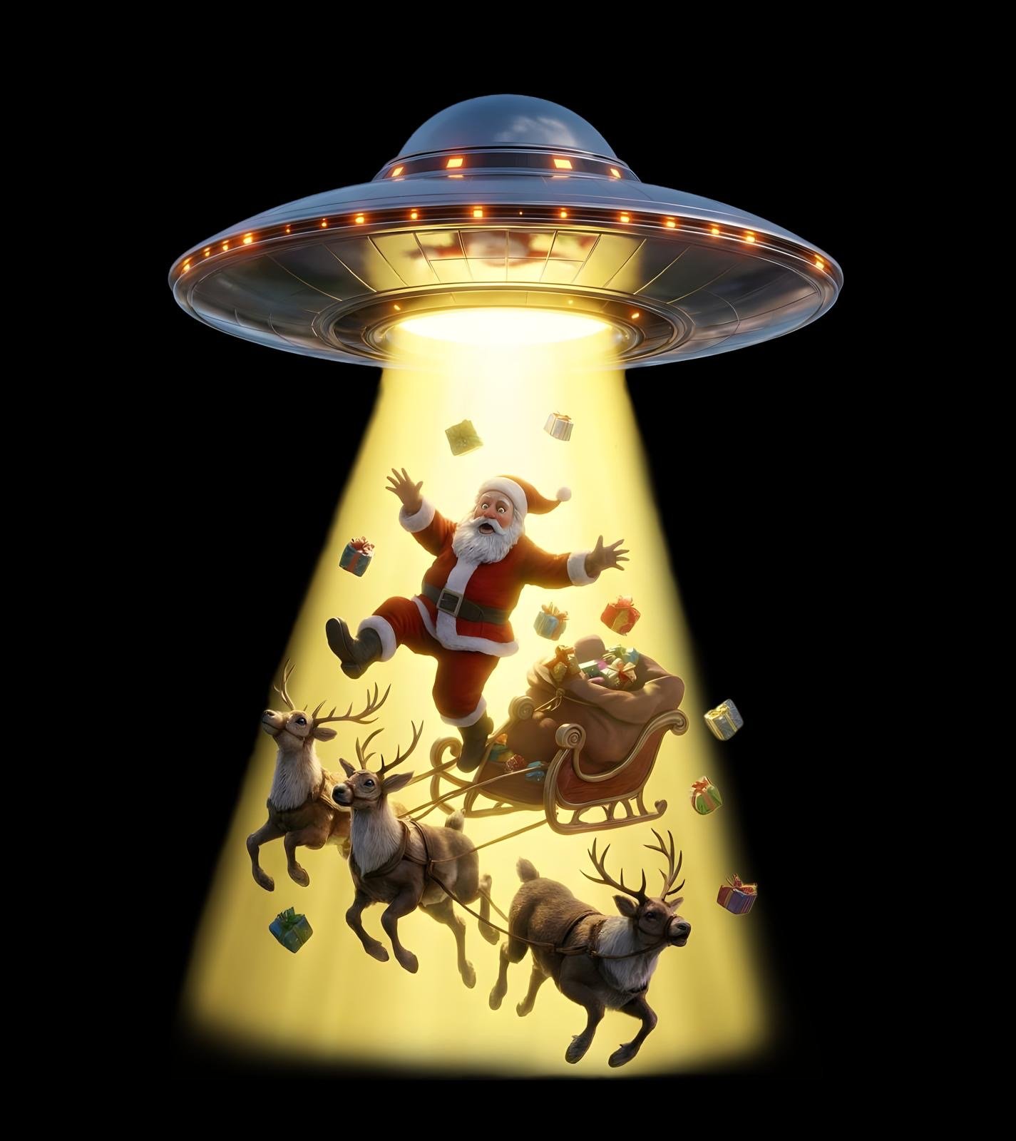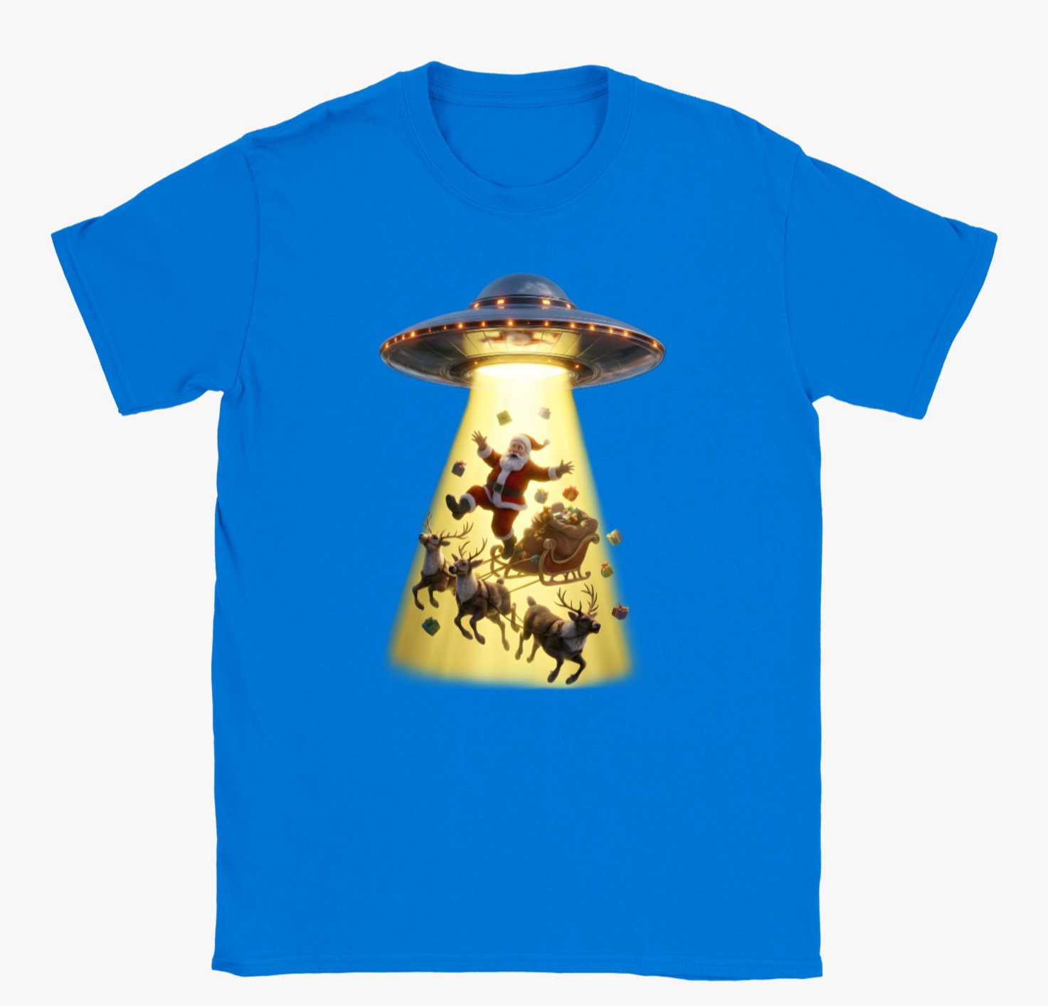This playful holiday t-shirt features a hilarious scene of Santa Claus being beamed up by a UFO, complete with his reindeer, sleigh, and scattered presents caught in the glowing tractor beam. With bright colours, detailed artwork, and a fun sci-fi twist on Christmas tradition, this design is perfect for anyone who loves festive humour, quirky graphics, and standout seasonal wear. A great gift for Christmas lovers and UFO enthusiasts alike.