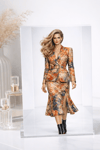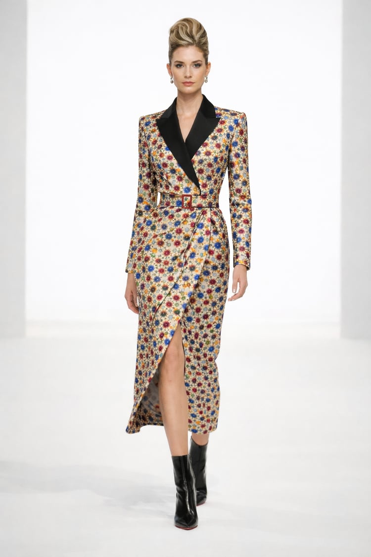A refined floral power suit that blends feminine elegance with commanding structure. This editorial look features a sharply tailored belted blazer paired with a fluid midi skirt, crafted in a rich, painterly floral print with silky depth and movement.