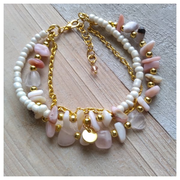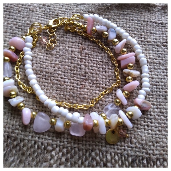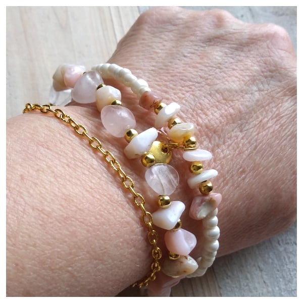 Pink Opals encourages the release of worry, fear or anxiety making them a useful gemstone (and pretty too) to dissolve stress, allowing you to be more centralized and tranquil. Ahhh, they're now, breathe in and breathe out. This layered bracelet can unlock our heart chakra in times of tension and stress. A perfect piece for someone to wear if they are struggling with any sadness. Helpful in the freeing of one's past trauma. A little bit of love on your wrist or give as a gift to someone special.
