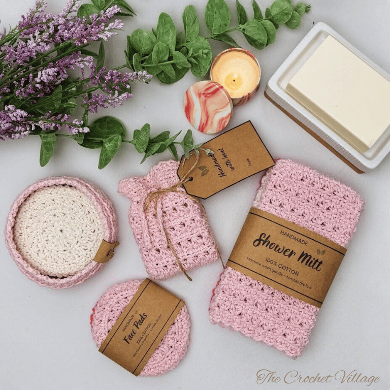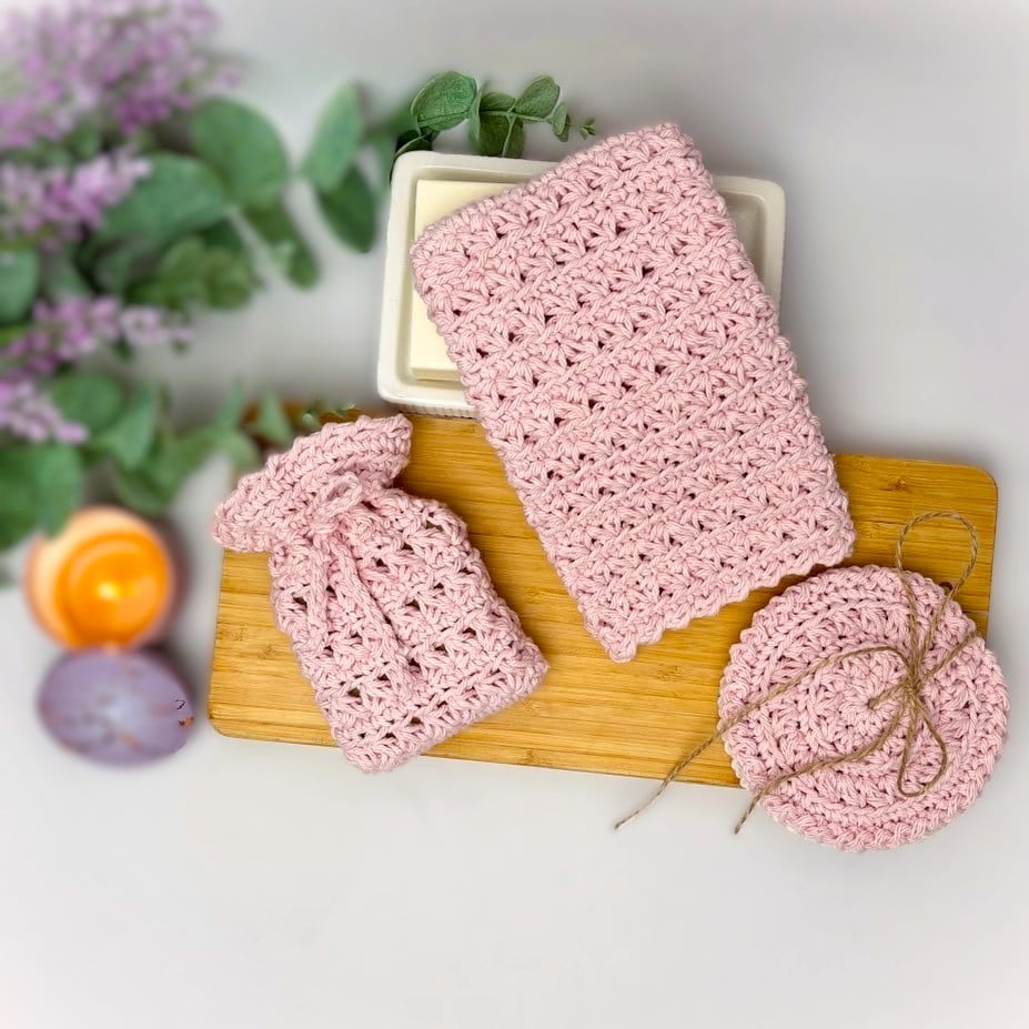 Create a luxury handmade spa bath set with this 4-in-1 crochet pattern bundle PDF — featuring a textured bath mitt, matching soap saver bag, reusable face scrubbies, and coordinating storage basket.