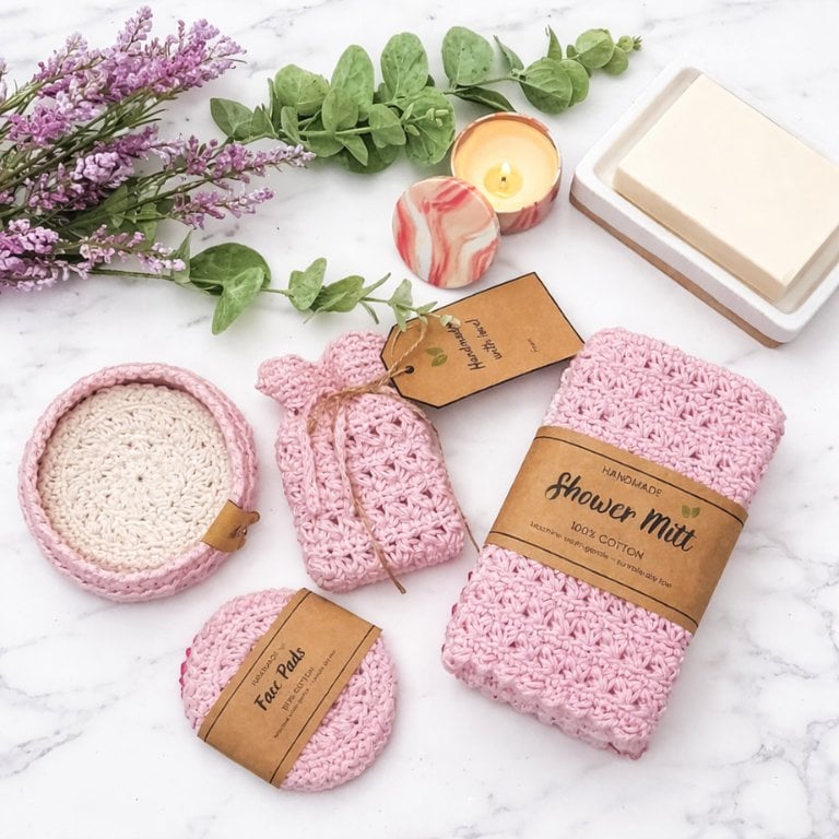 Designed to help you create a beautiful, spa-quality bath collection using cotton yarn, this bundle also includes printable product labels and gift wrap templates — making it easy to package and sell your finished sets professionally.