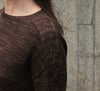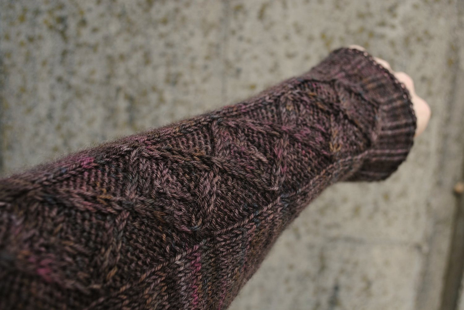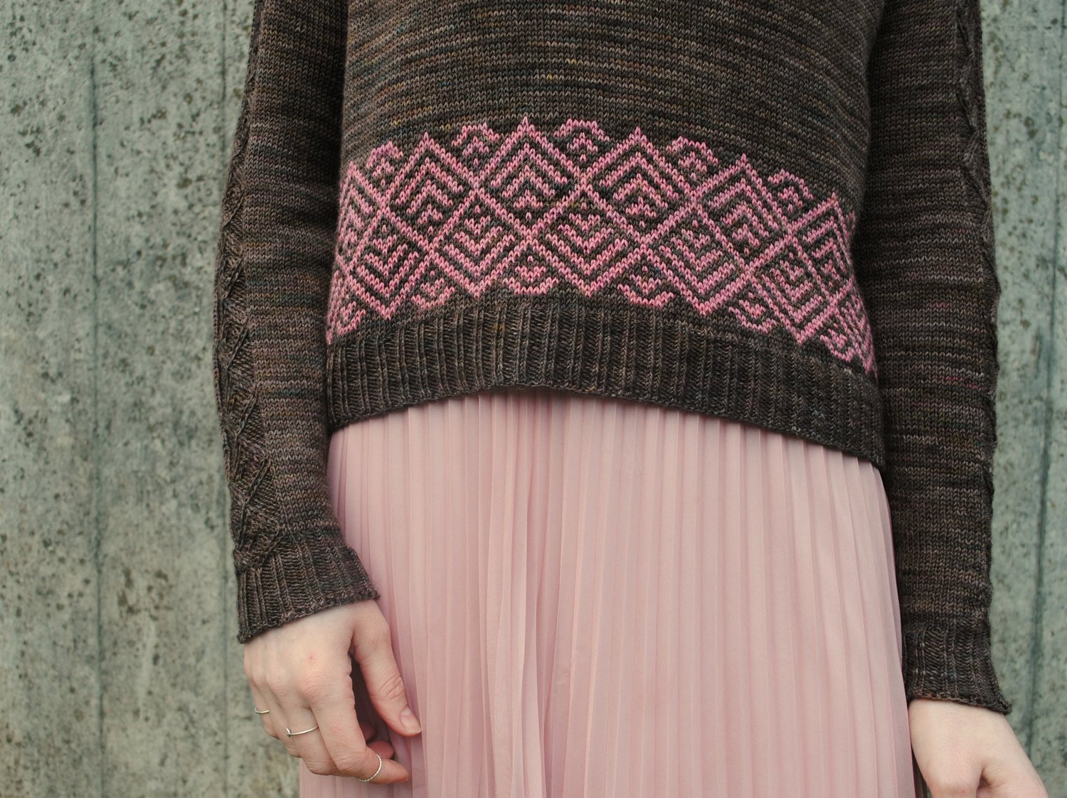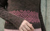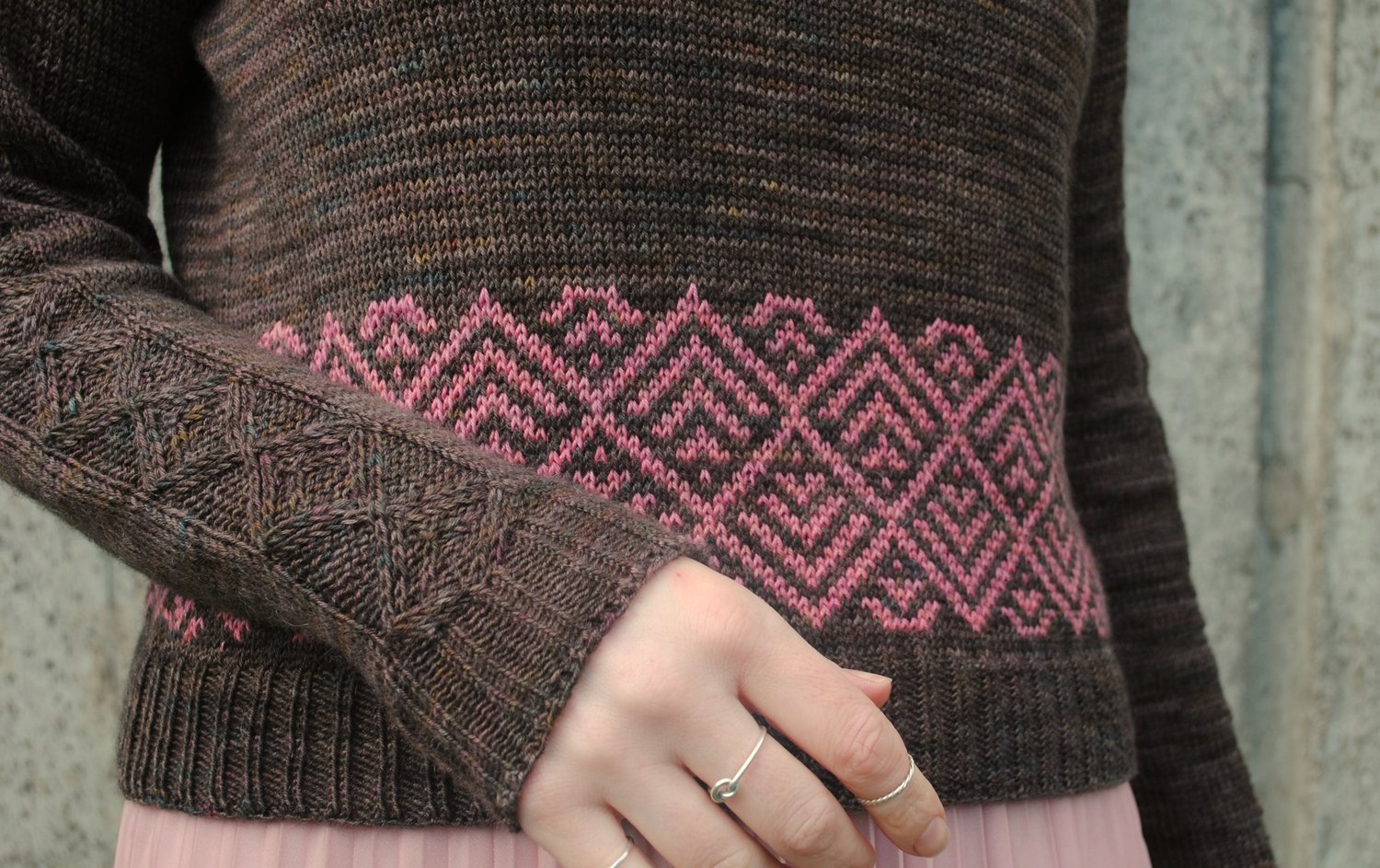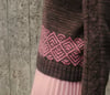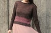 One of a Kind Yarn’s Merino / Mulberry Silk / Mohair light fingering base was used for this design (400m / 438yds per 100g). The Main Colour of the sample is a tonal brown and the Contrast Colour is a warm pink.