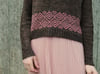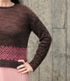 The wearer is 5’10” with a chest circumference of 37”. The sample has been worked in size M, giving 4.25” / 11cm of positive ease at the chest. The cropped body length has been worked, with an extra 9 rounds (i.e.: 1” / 2.5cm of length was worked in the body above the colourwork to allow for the wearer’s height. An extra 16 rounds (i.e.: 1.75” / 4.5cm) of length was also worked in the sleeves before starting the decreases.