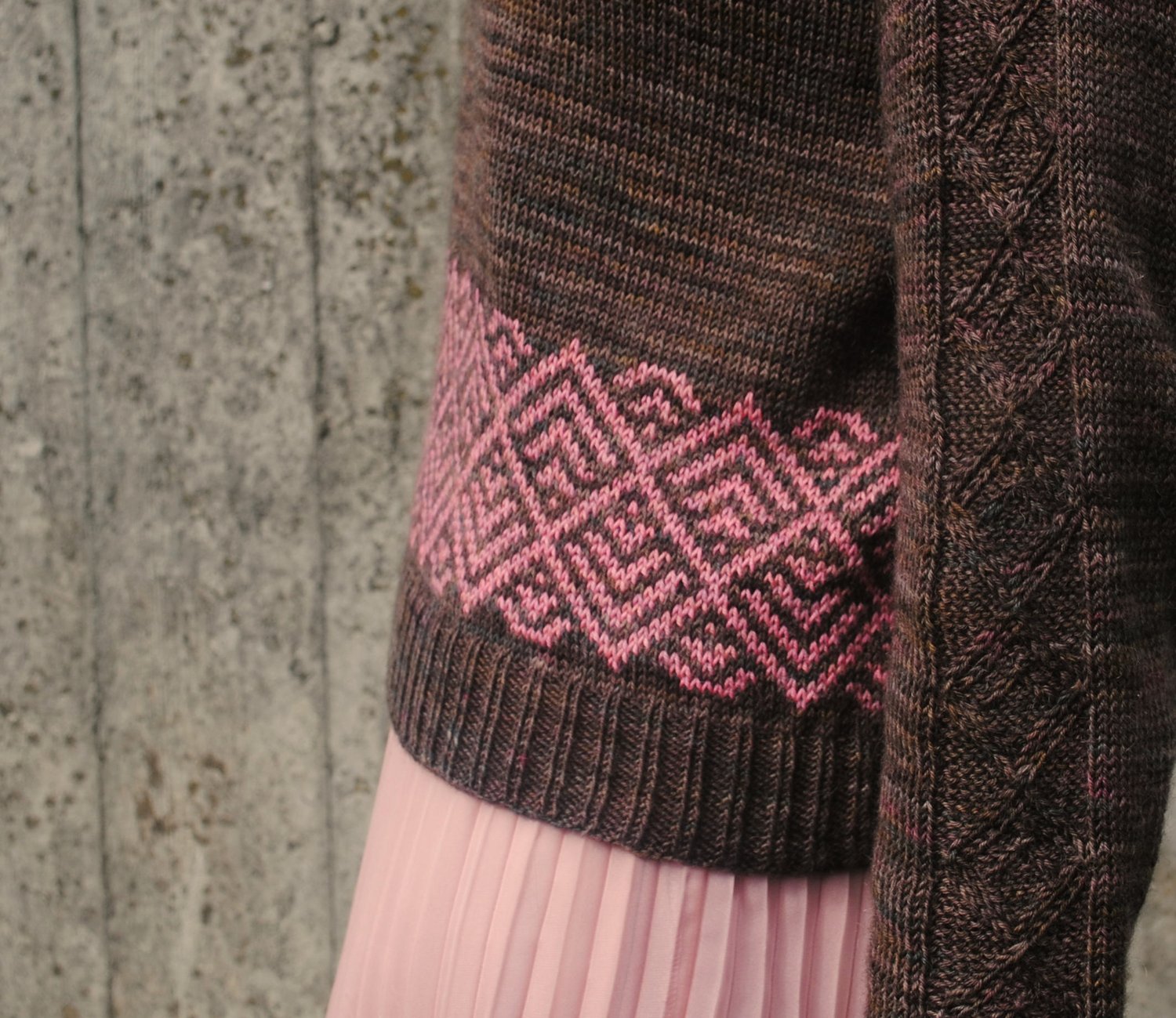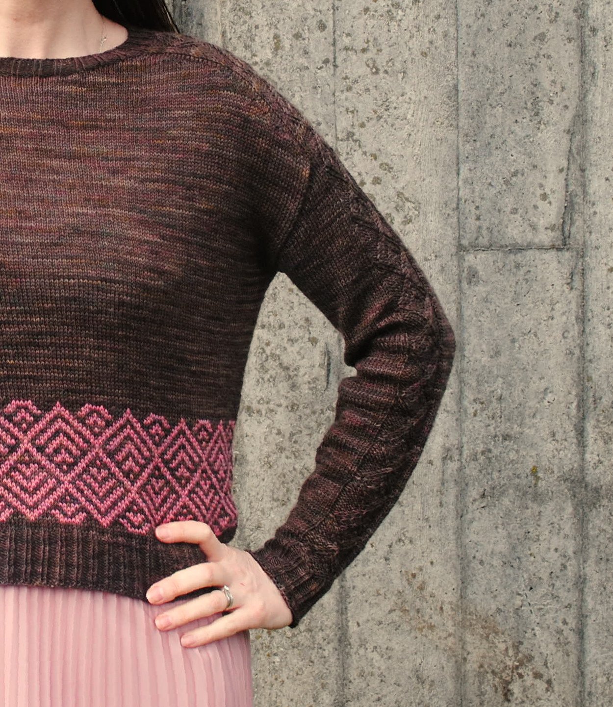 The Waves is a top-down sweater featuring eye-catching stranded colourwork above the waistband and a panel of cabled texture running from the shoulder and down the outside of the sleeve. The garment is worked top down, allowing the knitter to customise the garment as they work to suit personal preference. The fit of the body is oversized, with a modified drop-shoulder construction that allows the fabric to gently drape, and the sleeves are slim-fitting to allow the cable work to take centre stage. Two body lengths are offered in the design: cropped and full length.