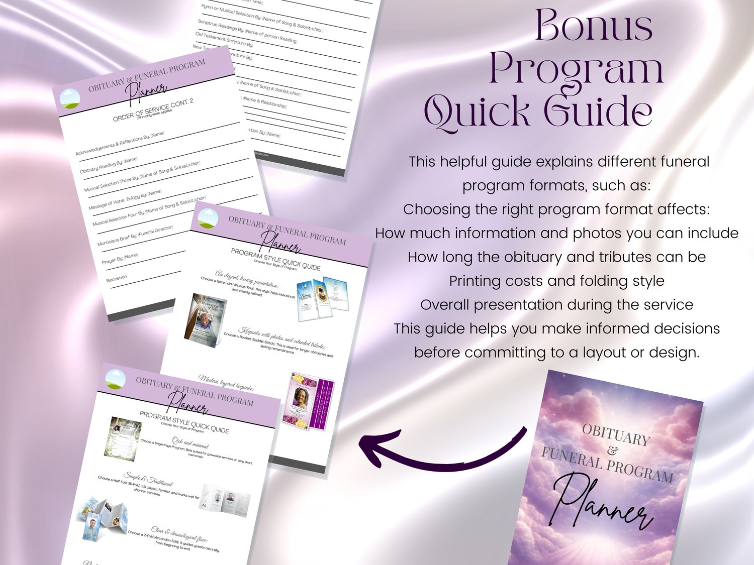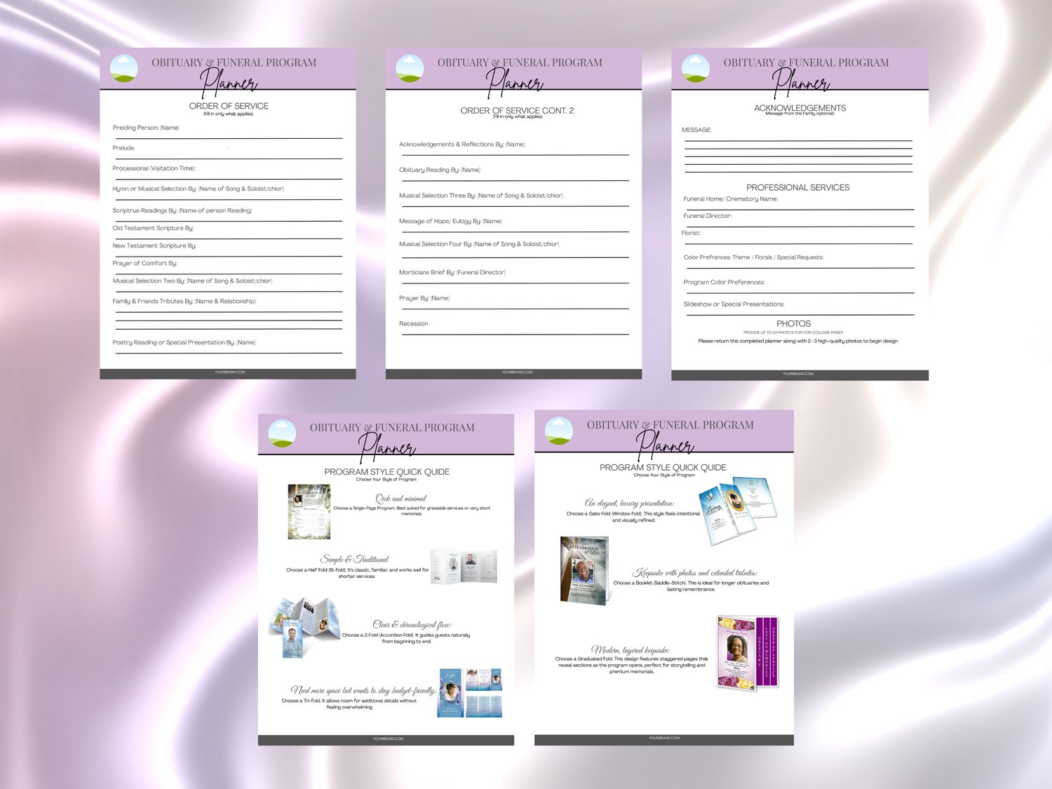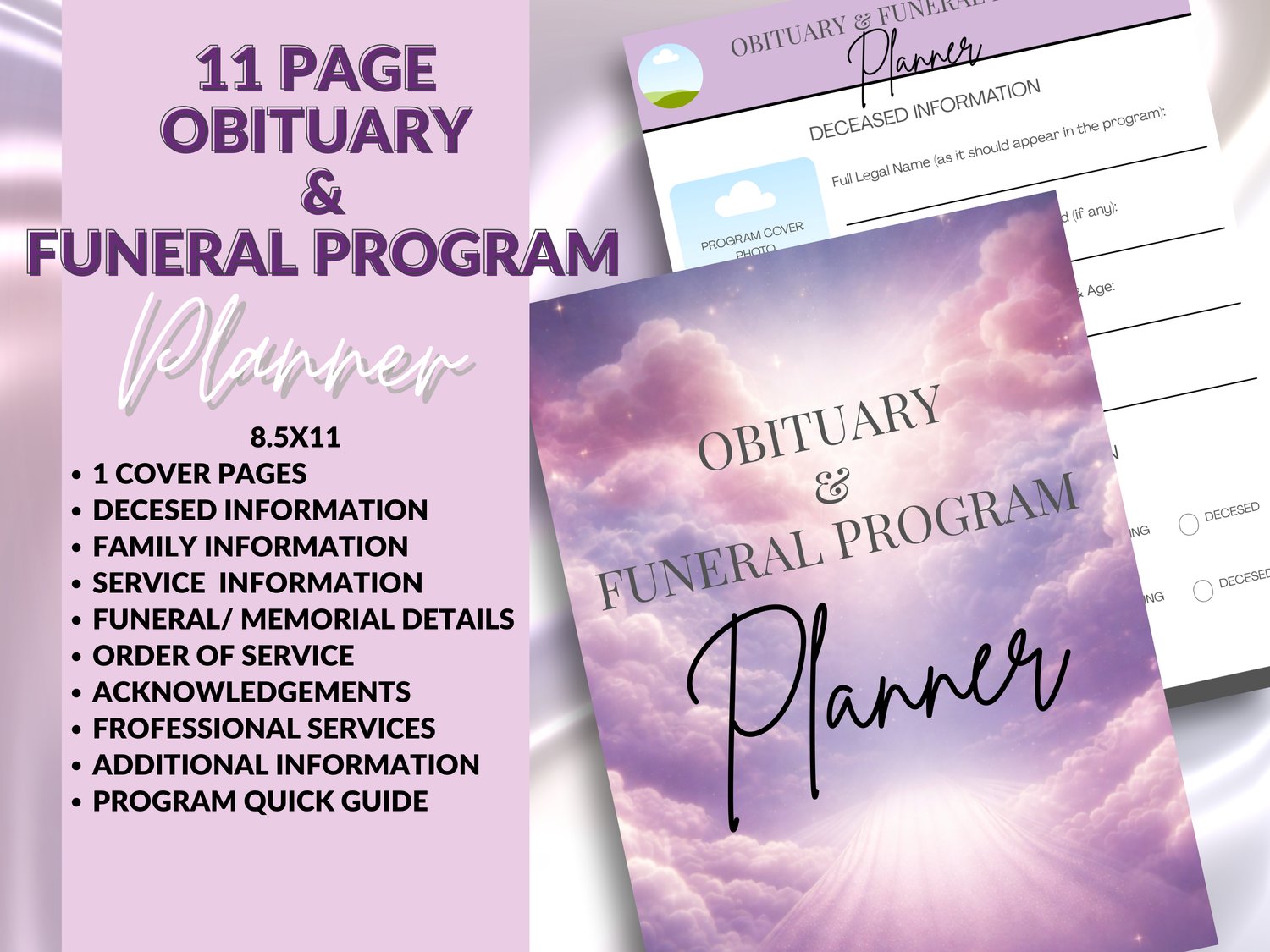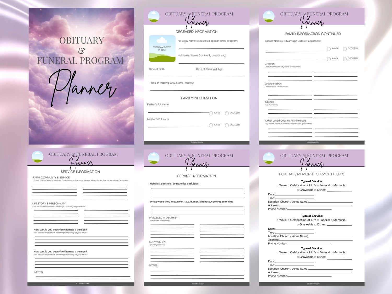 This 11-page printable obituary and funeral program planner bundle is designed to help families thoughtfully plan both the obituary and the order of service with clarity and confidence. Instead of trying to remember everything at once, this planner walks you step by step through the information needed to create a meaningful, well-organized memorial program.
