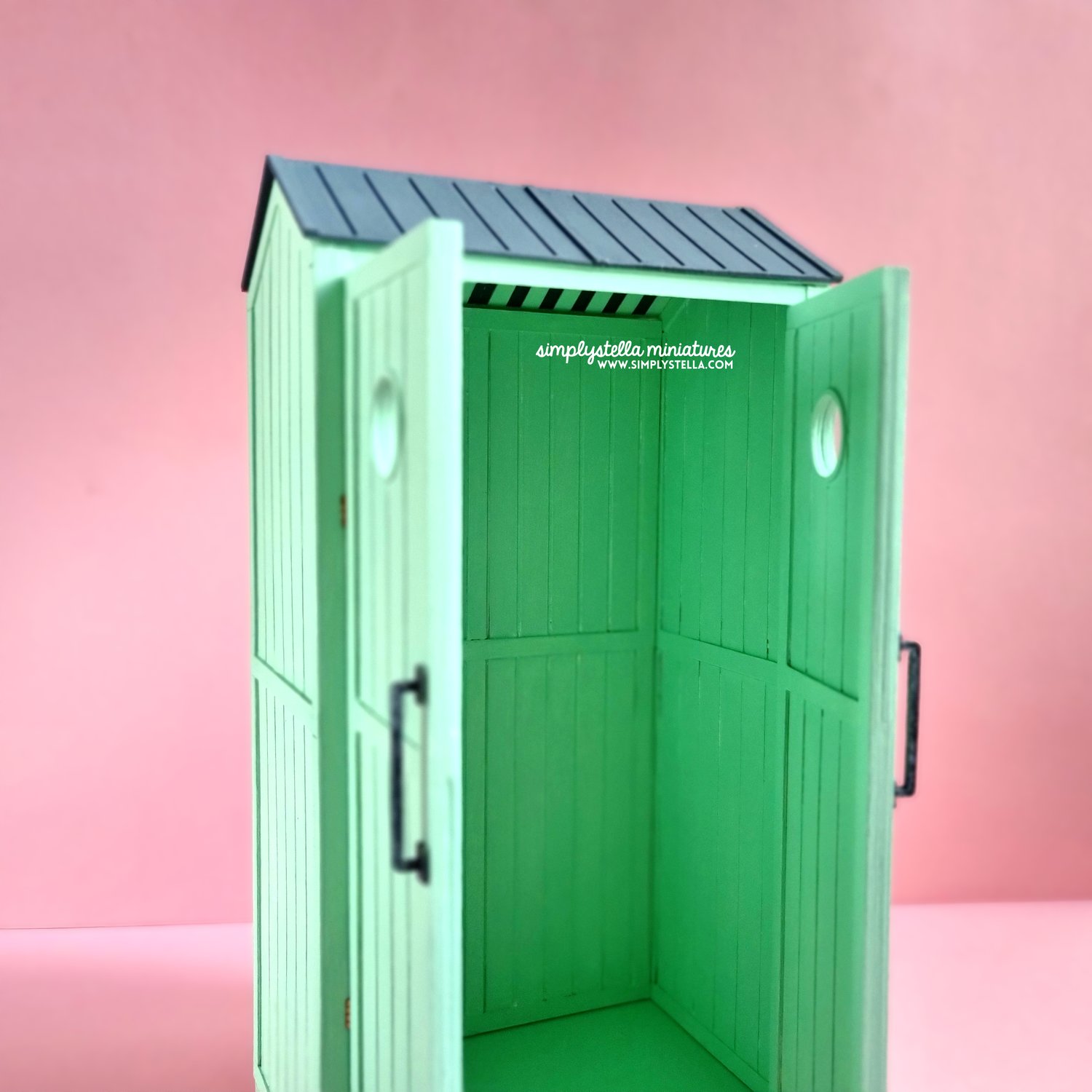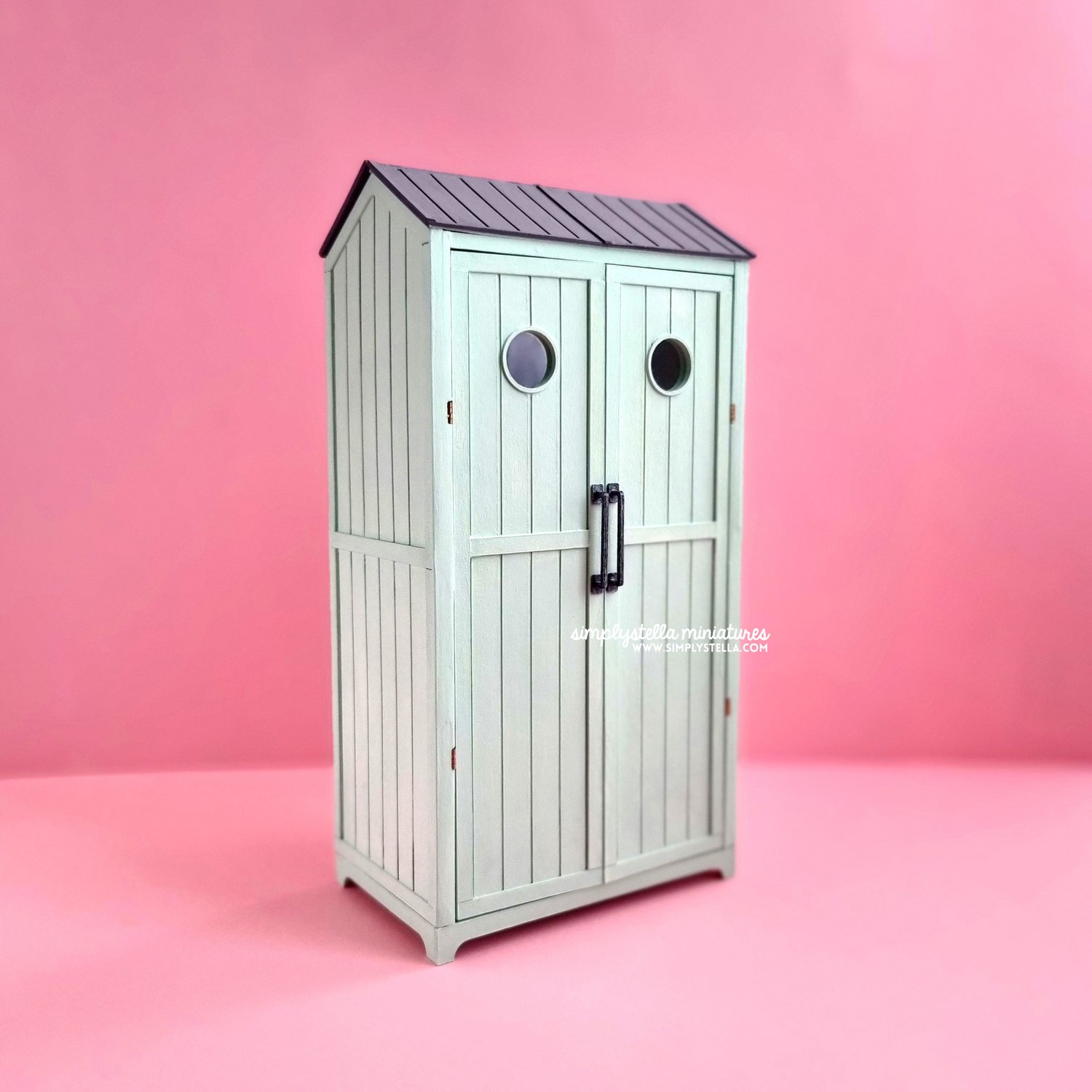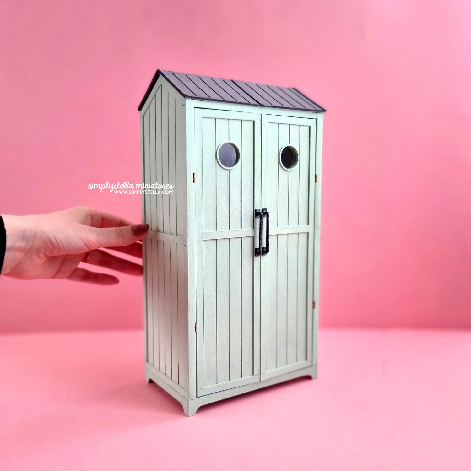This miniature garden shed features working hinged doors and is perfect for dolls like Barbie, Blythe, and Monster High.