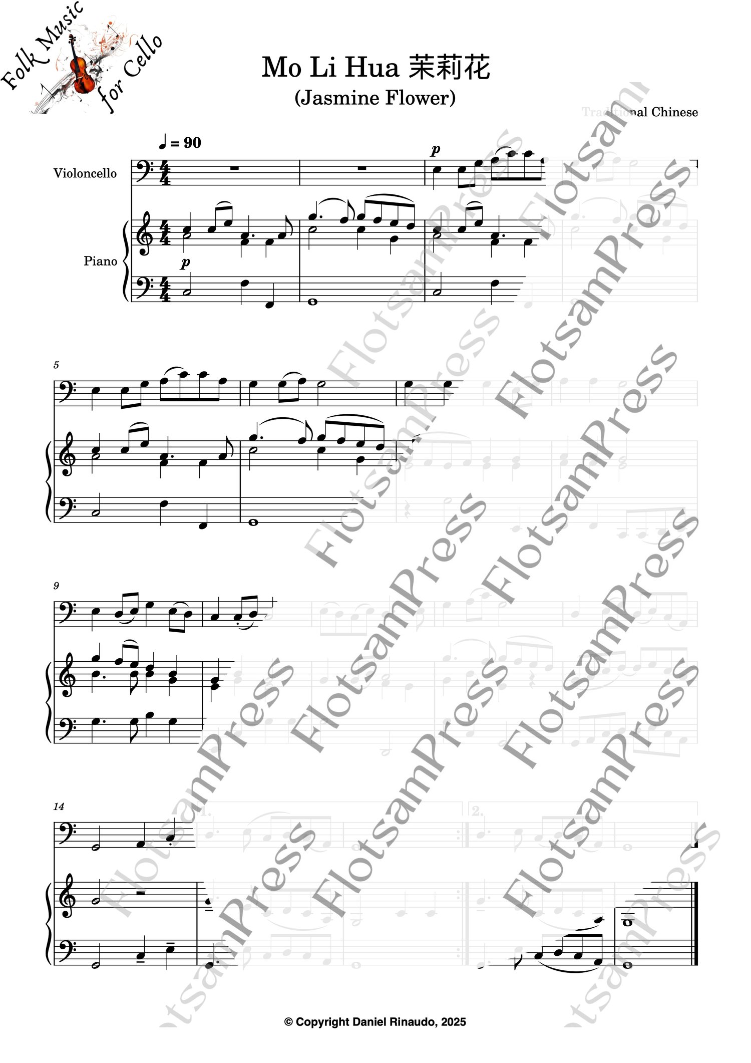 This arrangement of Jasmine Flower is written for beginner to lower-intermediate cello players, with a simple and supportive piano accompaniment. Perfect for church services, lessons, or home practice.
