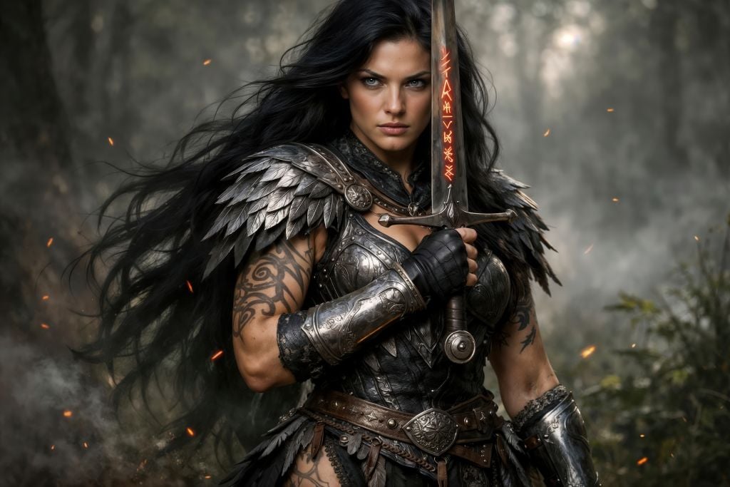 Fog clings to the forest. Embers drift on the wind. And in the center of it all stands a warrior carved from myth—iron-clad, tattooed, unshaken—her runeblade burning with ancient power.
