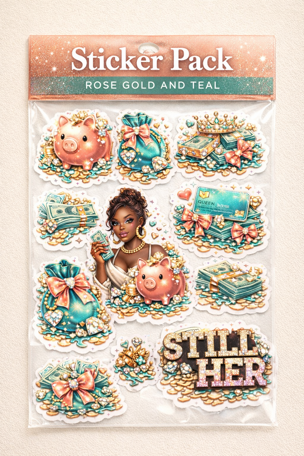 Each sticker features rose-gold accents, teal luxury tones, diamond details, and gem-encrusted typography, all wrapped in a premium glossy finish. From jeweled piggy banks to money stacks and affirmations, every design speaks abundance.
