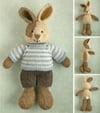 This pattern file contains full instructions for knitting and finishing off a little cotton rabbit with a stripy sweater and shorts and has over 50 detailed step-by-step photographs along with full pattern instructions and tips for stuffing, seaming and finishing neatly. The pattern is written for knitting flat on two needles and is seamed at the end and is suitable for intermediate knitting skills. Please note however that this project is not a quick or simple knit. It takes around 14 hours to make and finish this little rabbit and just under half of that time is spent on the finishing off. There are lots of separate pieces which require seaming and sewing and if you are looking for something fast and easy you would probably be better off finding a different pattern. That said this PDF file will give you all of the information and techniques that you need to knit the little bunny pictured. Also included are other options for the design of the head so you can choose which you prefer for your bunny.