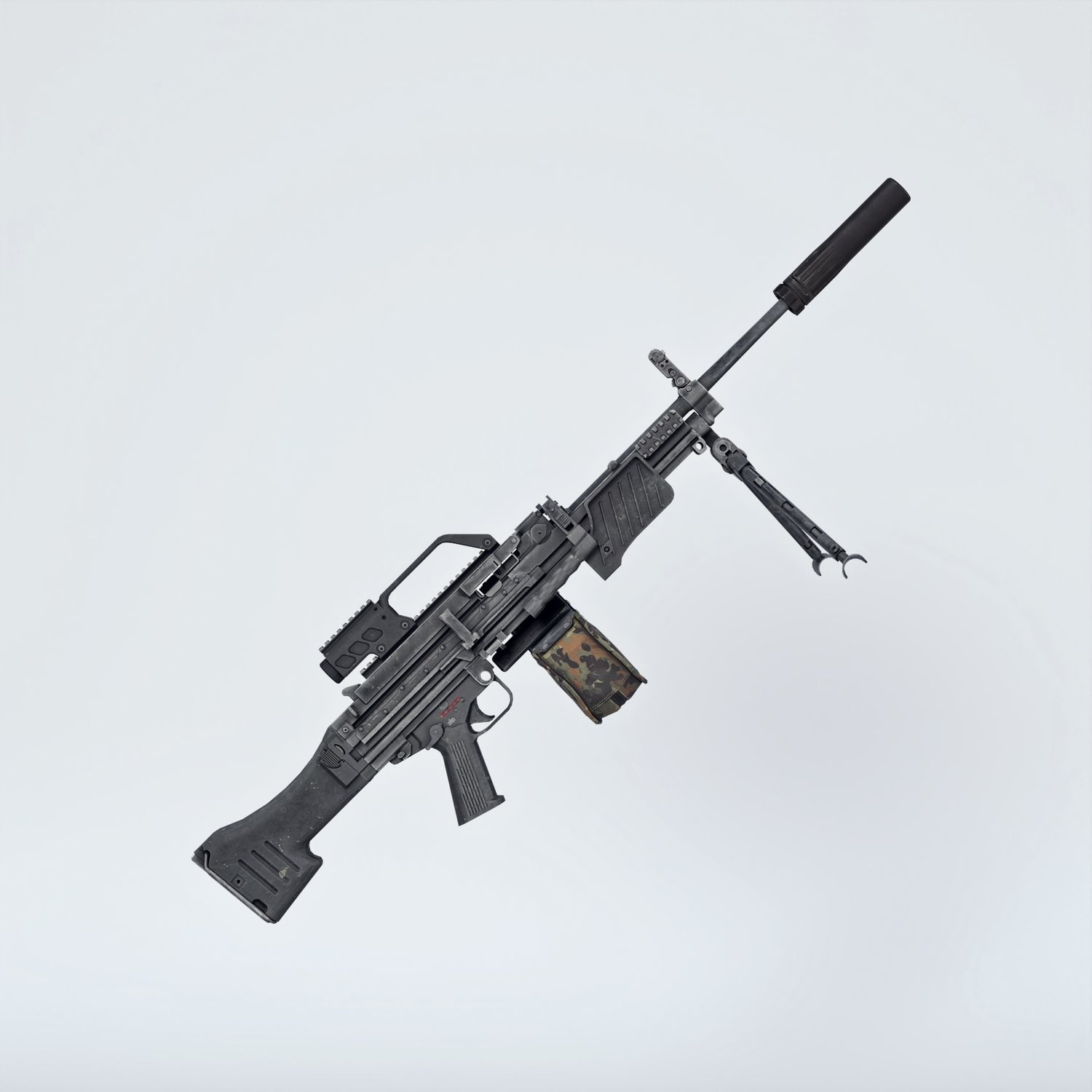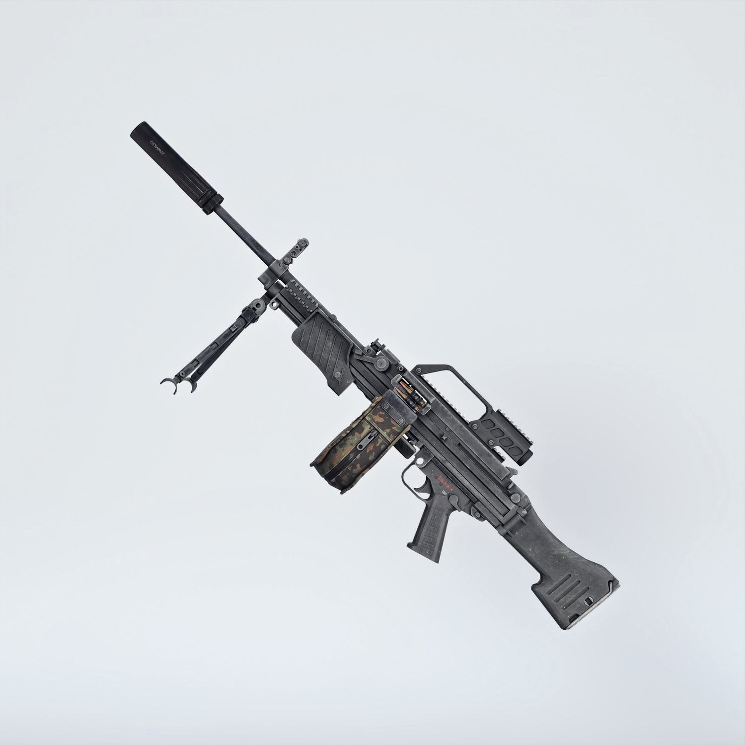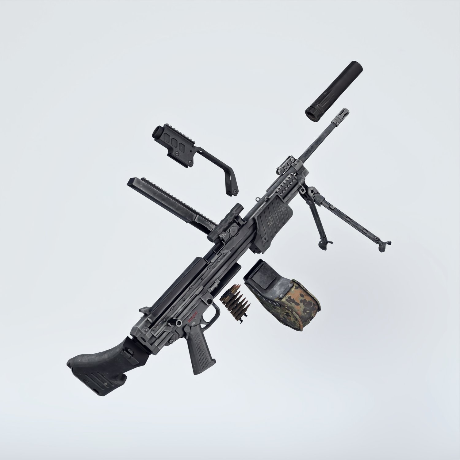 An cool German light machinegun, to go in pair with heavier options. Light, cool looking, with plenty of rails to mount your attachments. The prop is rigged and converted for use with DAZ. Trigger, charging handle, bolt, bipod, etc also rigged for more realistic pictures. Stock folds so the gun can be pretty compact for a machinegun.