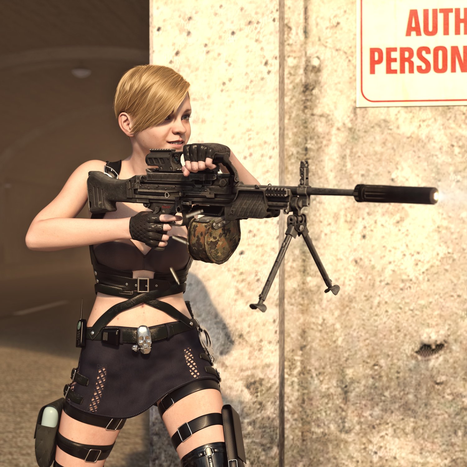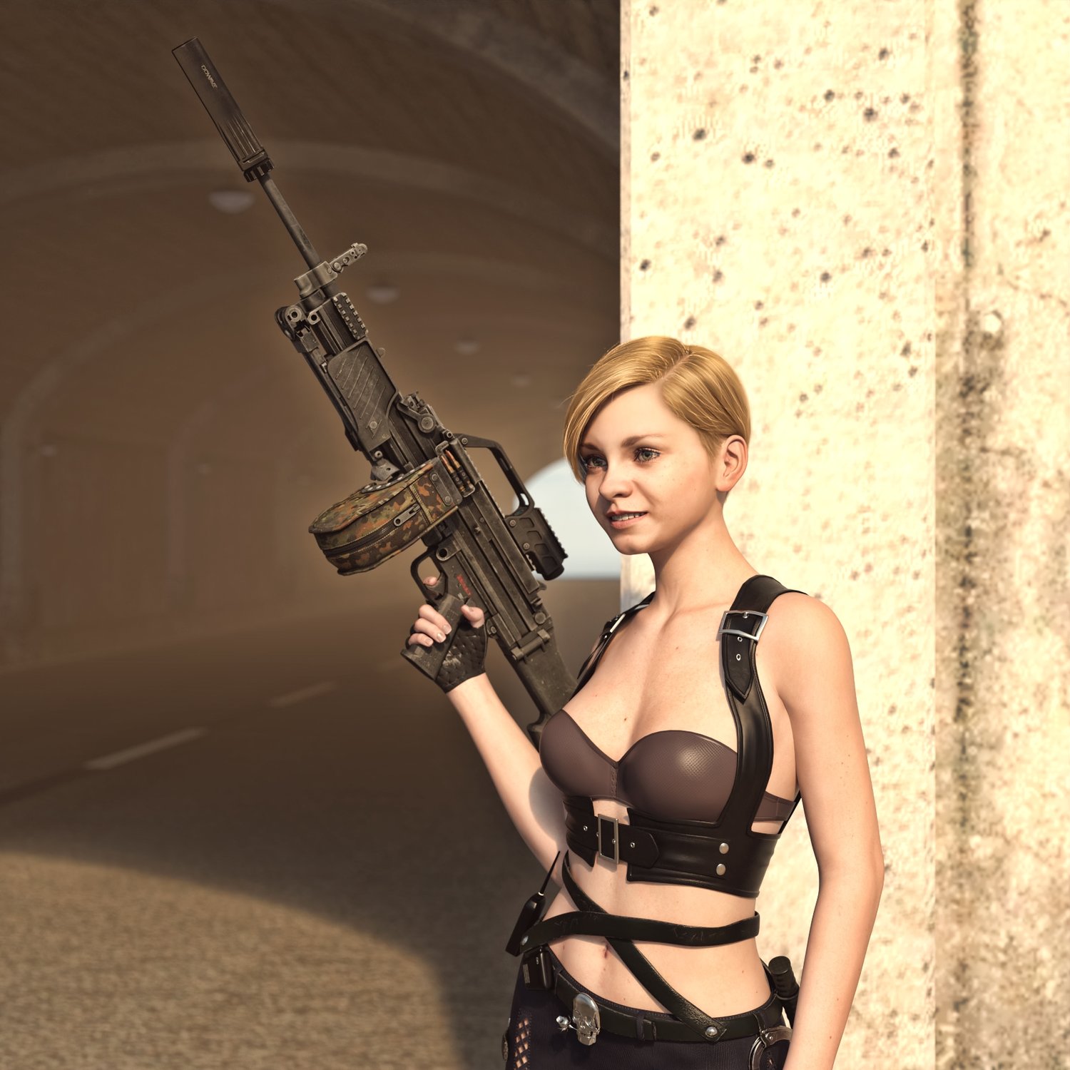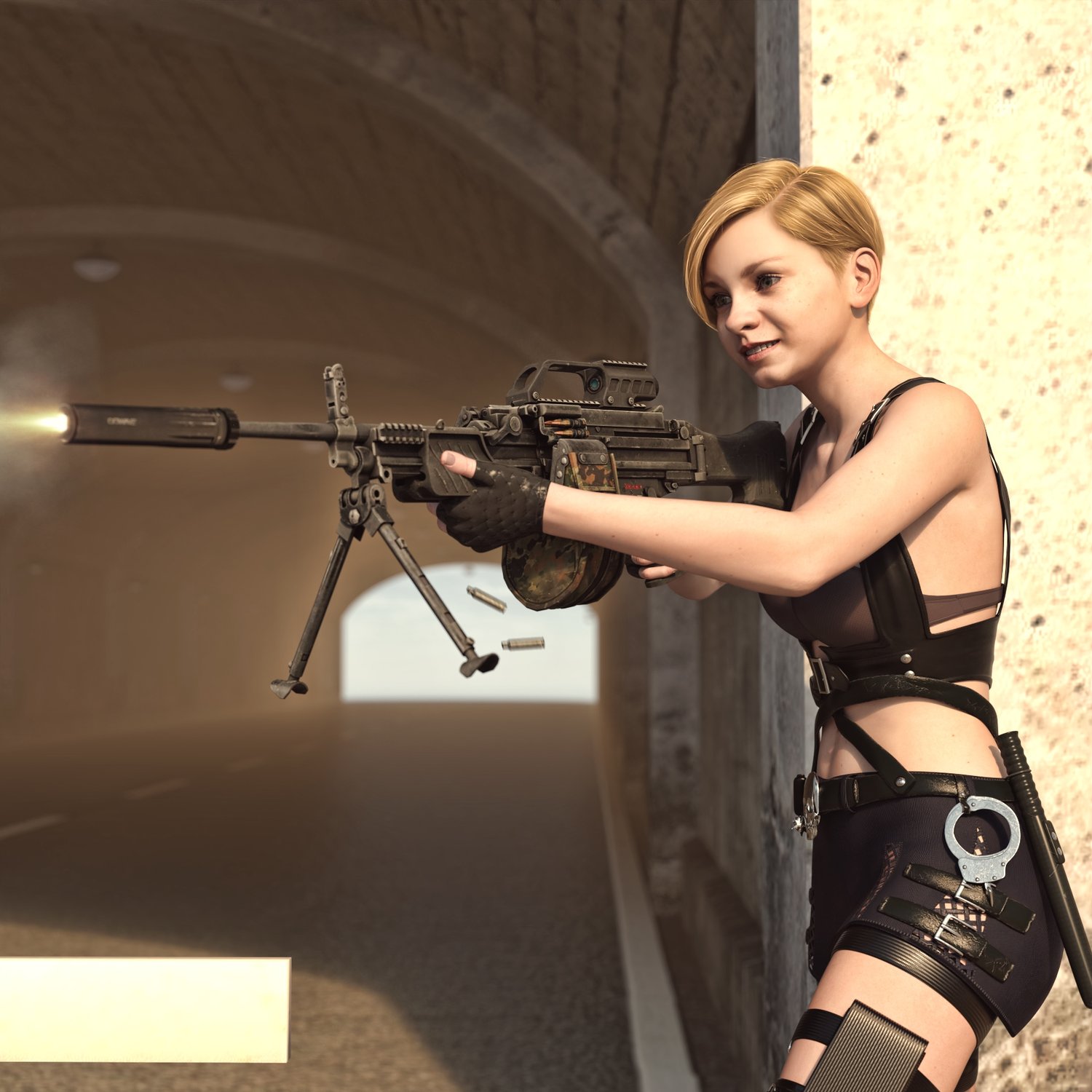 An cool German light machinegun, to go in pair with heavier options. Light, cool looking, with plenty of rails to mount your attachments. The prop is rigged and converted for use with DAZ. Trigger, charging handle, bolt, bipod, etc also rigged for more realistic pictures. Stock folds so the gun can be pretty compact for a machinegun.