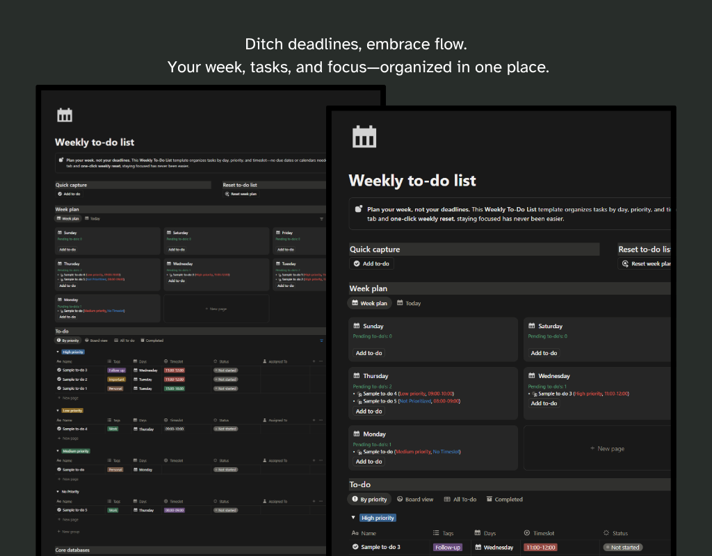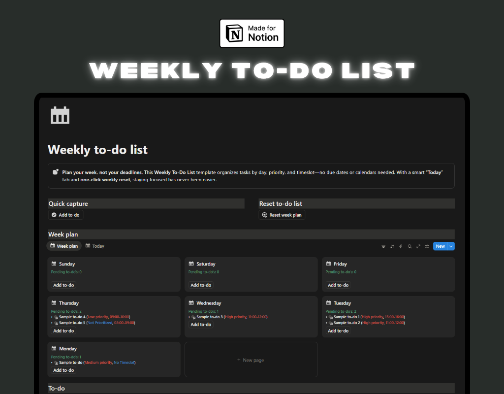 The Weekly To-Do List is a simple yet powerful Notion template designed to help you organize tasks across the week without relying on due dates or calendars. Instead, it works with two connected databases—Days and To-Do—making weekly planning more intuitive and flexible.