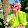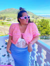 The Bette bed jacket is modeled after the beautifully detailed, frilly “bedroom jacket” peignoirs that were popular in the 1950’s and 1960’s, designed to be worn over lingerie. I originally conceptualized the design when I was wanting a light piece to layer over some of my ~special occasion~ garments that would be versatile and comfortable, but would still look and feel fancy. The knit fabric gives more weight to the structure, resulting in a garment that maintains the pretty glamour of the original bed jackets but is practical enough to be worn in public!