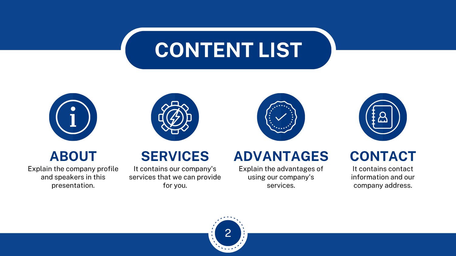 The white-and-blue color combination gives your presentation a refreshing, credible, and modern look. It reflects stability and reliability—ideal for businesses wanting to make a great first impression.