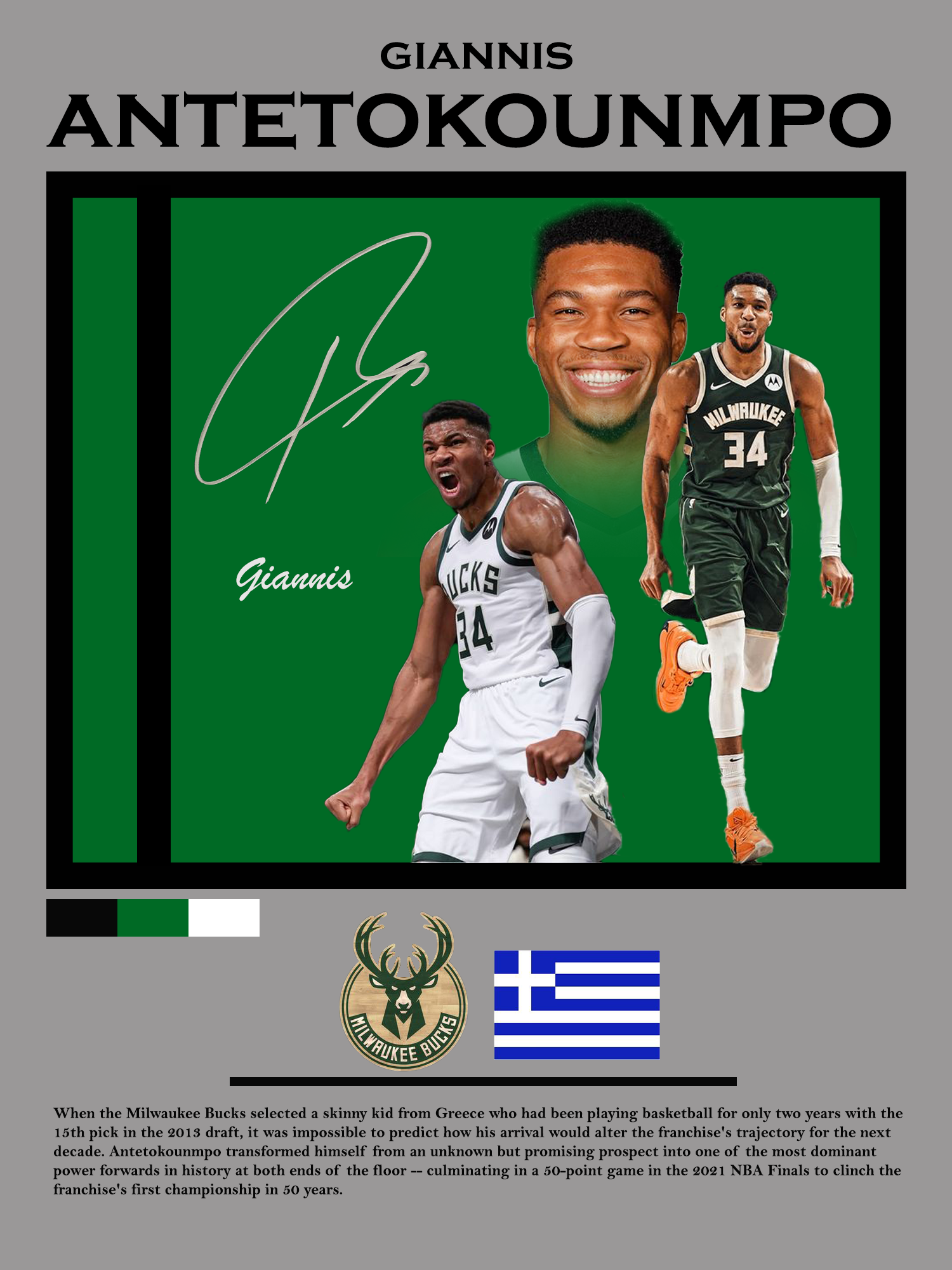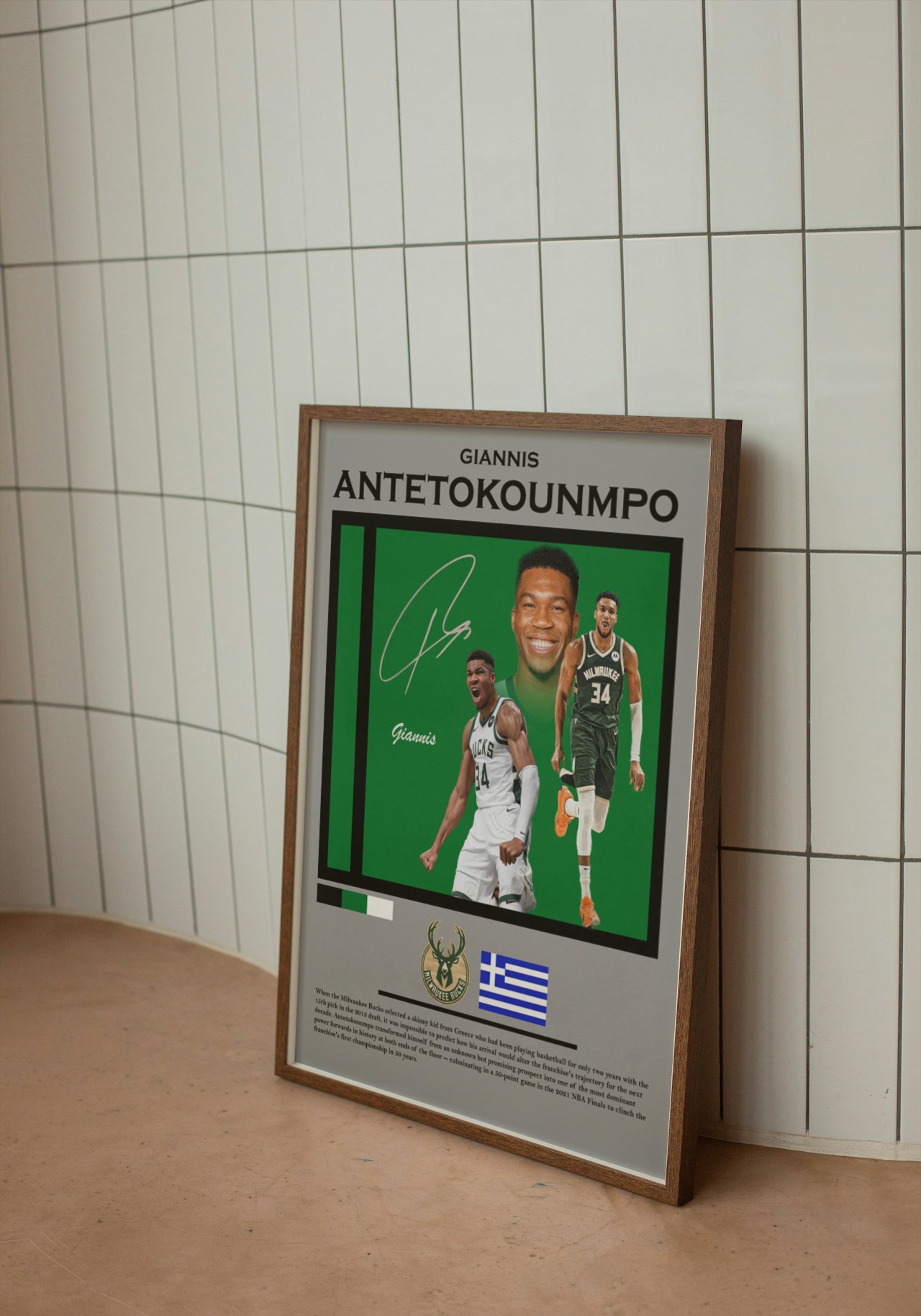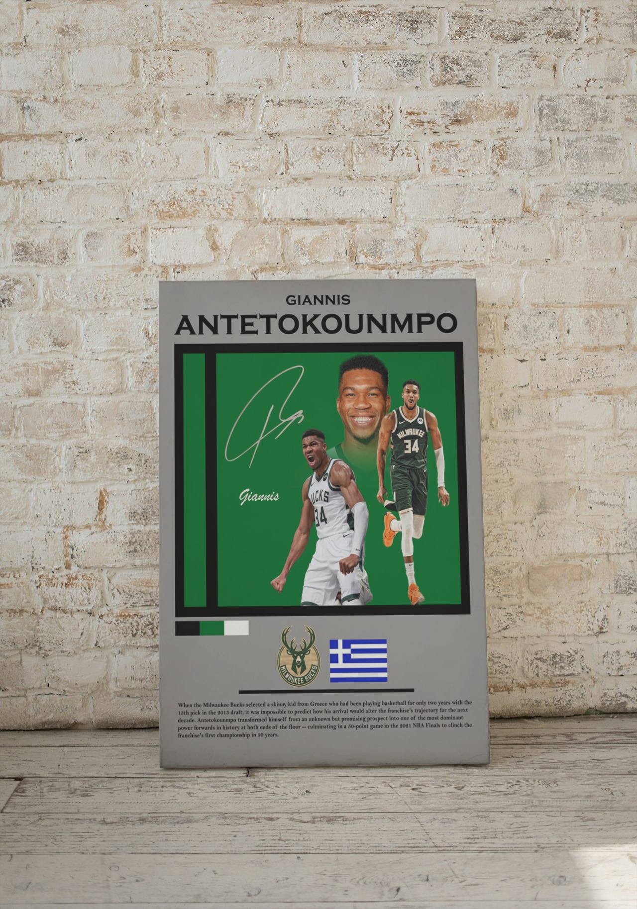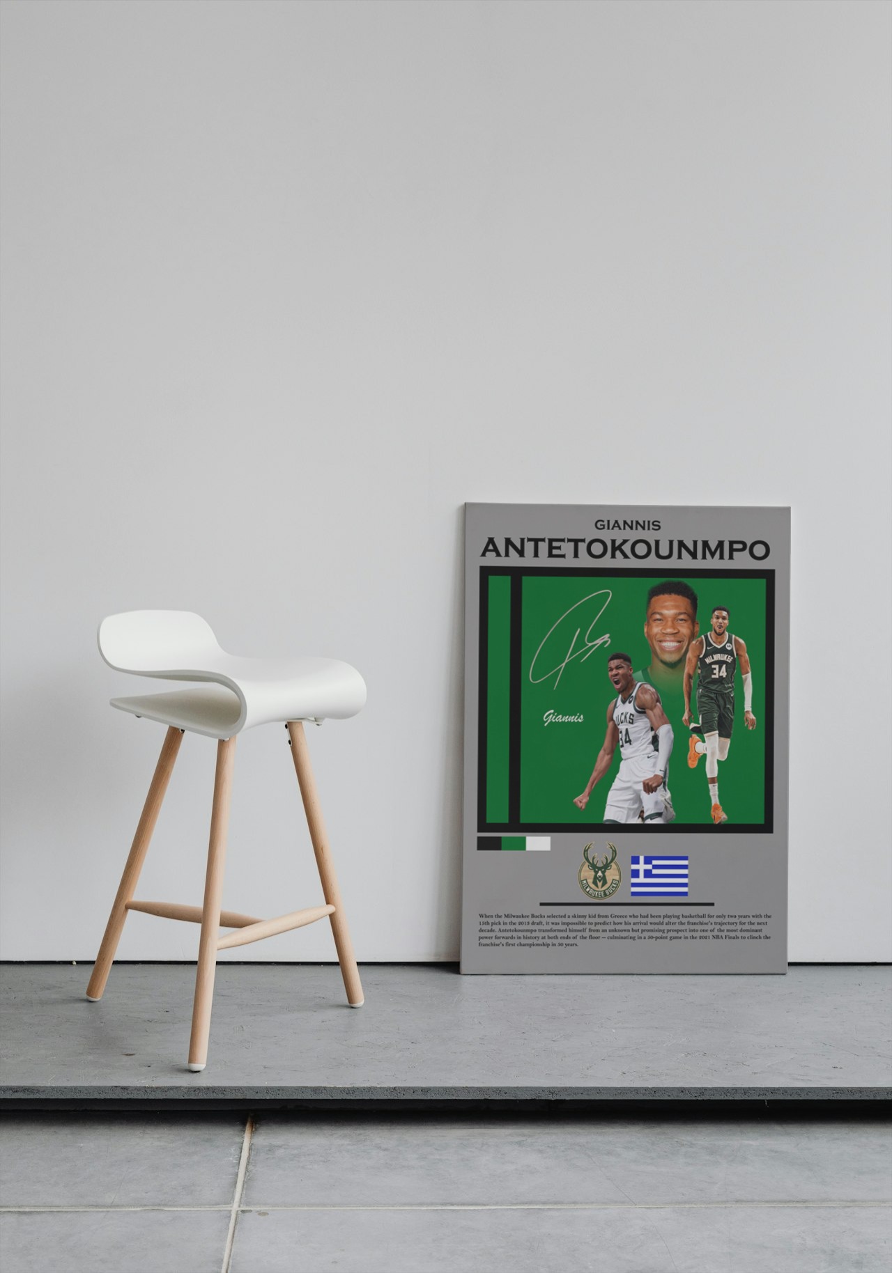 Featuring high-quality imagery and a dynamic design, this poster is perfect for any fan looking to celebrate Giannis's extraordinary talent and achievements.