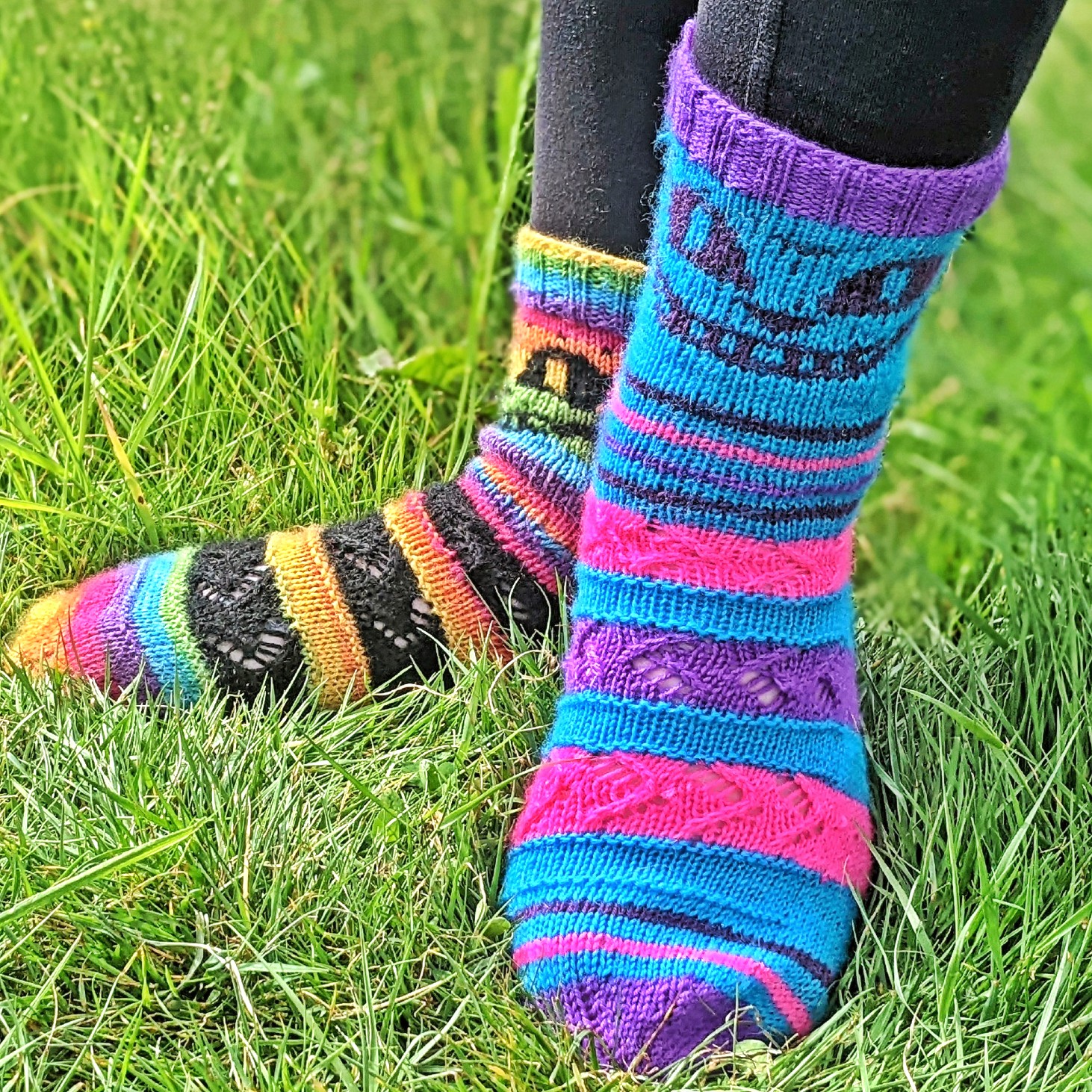 This cuff-down sock with a heel flap features a Grinning Cheshire Cat design. Cats eyes beam out over a wide grin. Lace arrows point the directions you may take and the cat fades into the shadows through the lace.