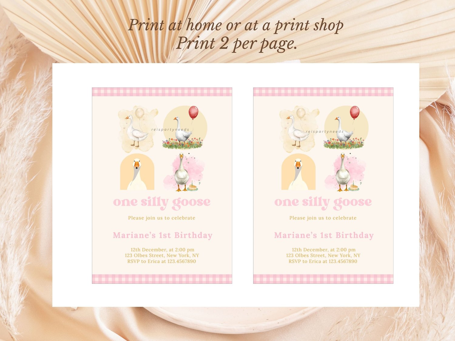 One Silly Goose First Birthday Invitation, Editable Template Cute Pink Gingham Goose Party Invite, Pastel Goose Theme Girl 1st Birthday