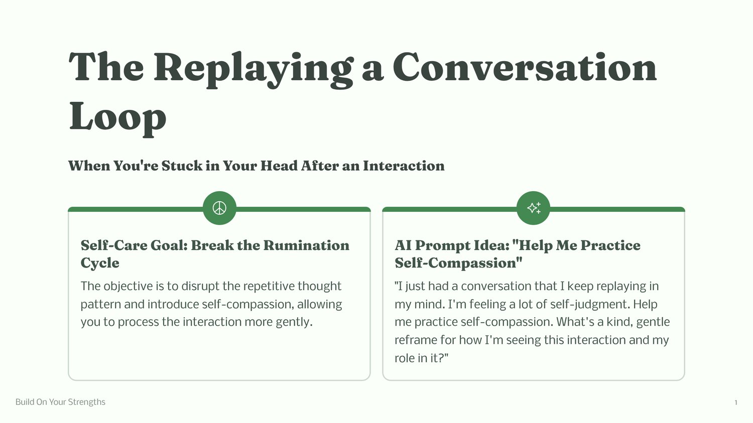 Specific AI prompt ideas are included for self-care in common scenarios like overwhelm, replaying conversations, and vague anxiety, as well as prompts for restoration through gratitude practice, celebrating small wins, and finding calm.