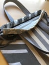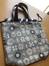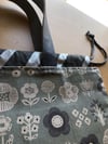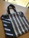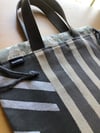 Measures between 32-35 cms by 32-38 cms, has 1 inside pocket, leather handles made from waste of shoes industry.