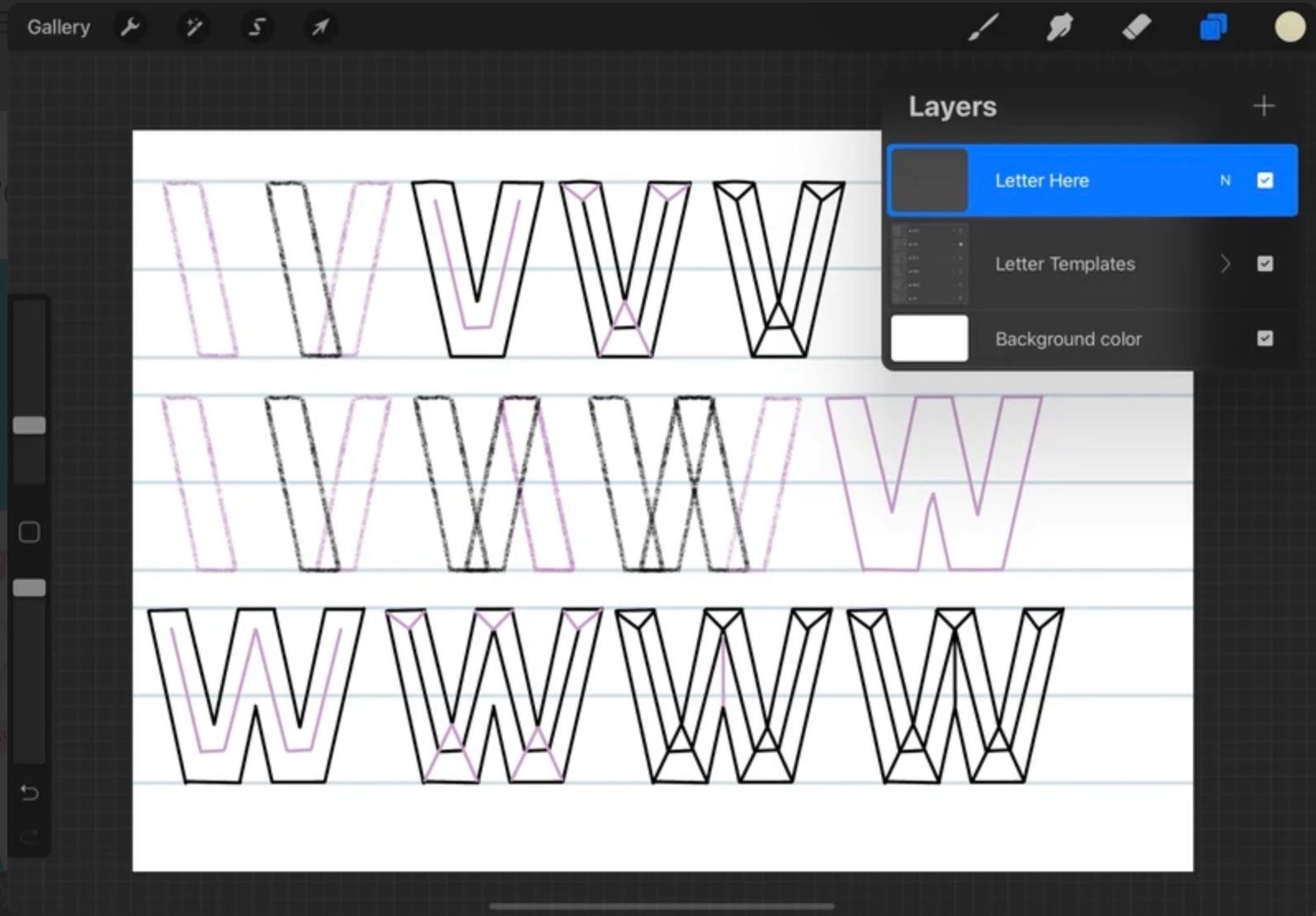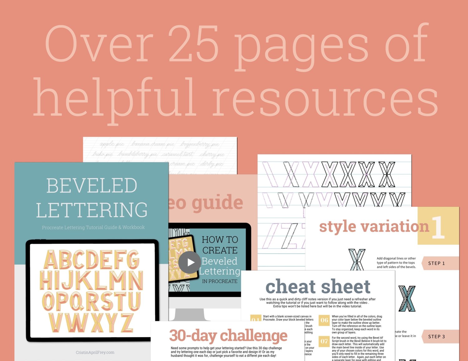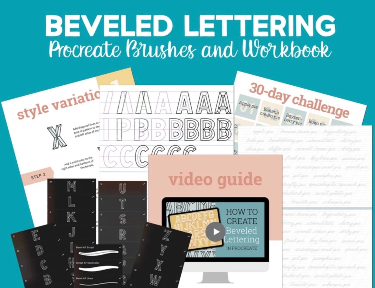 The workbook includes practice pages with step-outs to show you how to make each letter. It comes as both a PDF file (if you want to print and use a pen/marker) and a Procreate file (if you want to do ipad lettering on practice sheets right in Procreate. The video tutorial covers how to make a beveled look with both block and script letters. Combine them for an extra fun design!