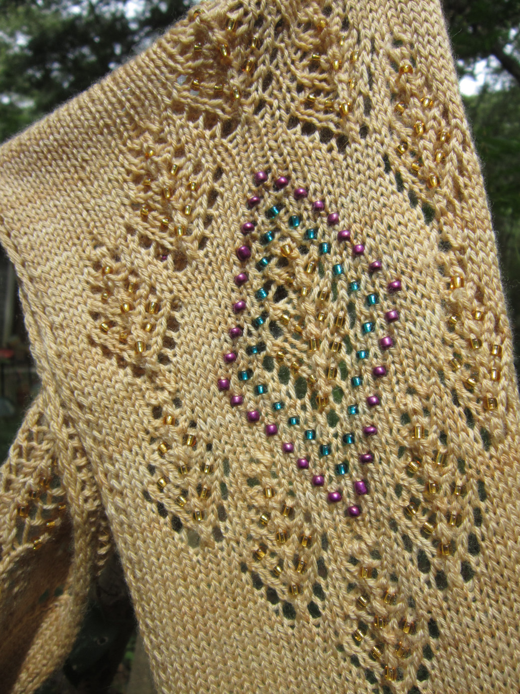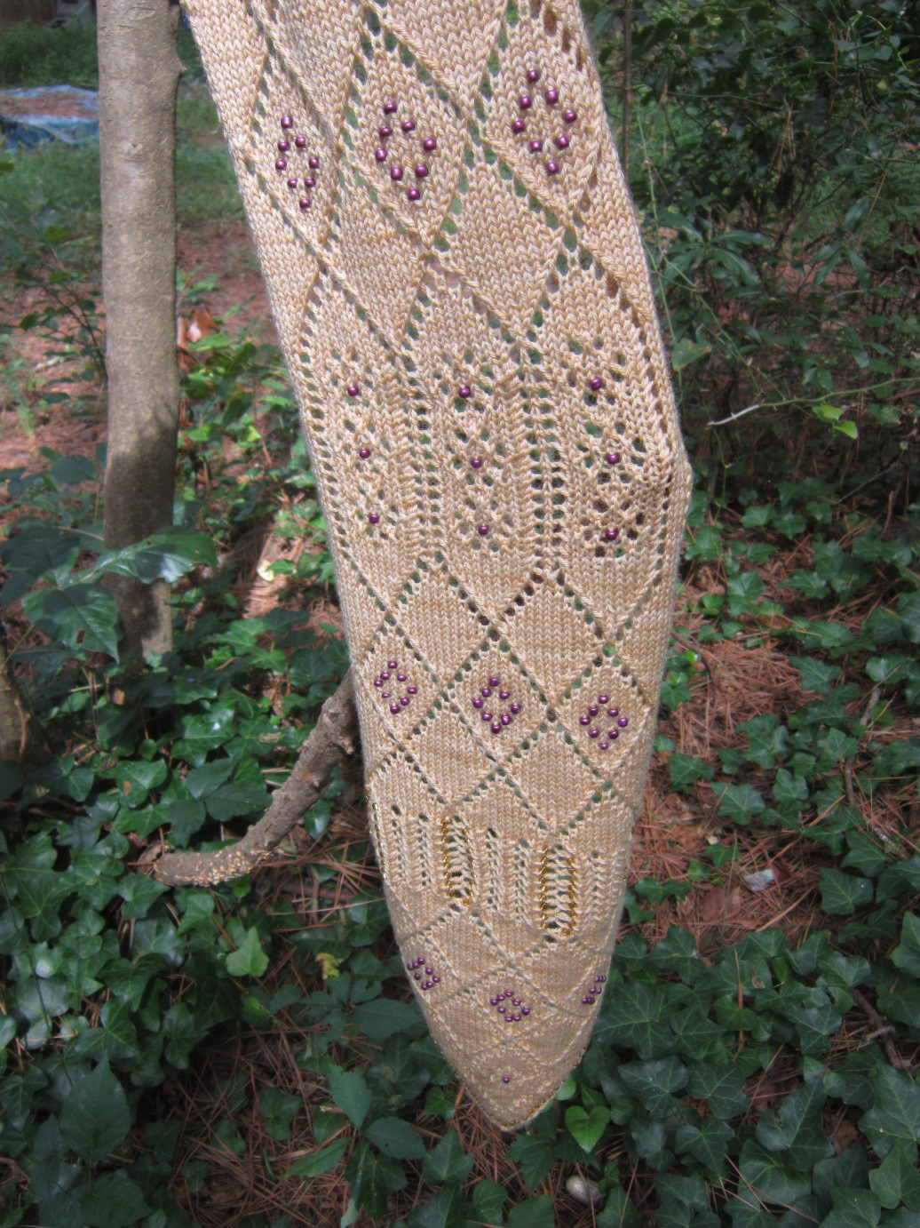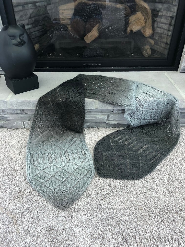 The yardage requirements will depend on if you knit the scarf without any embellishment (beads or Nupps) or if you use beads throughout. For that scenario, you will need 550 yards of fingering weight yarn. If you are a fan of Nupps and use those instead of beads, you will need 700 yards of fingering weight yarn (Like dragons, Nupps have voracious appetites.)