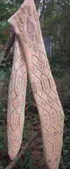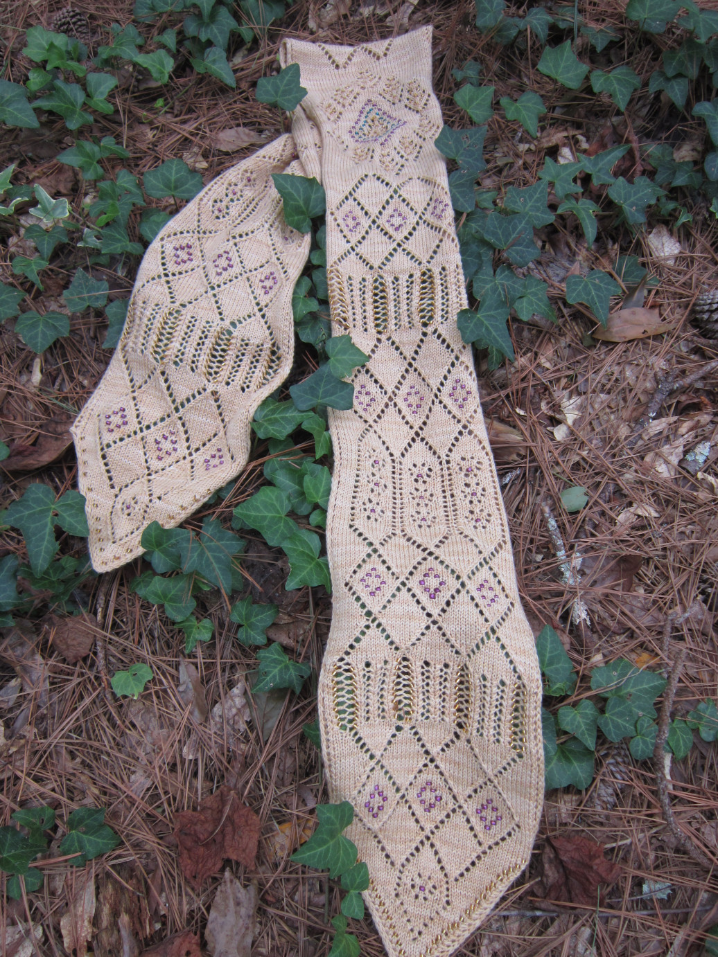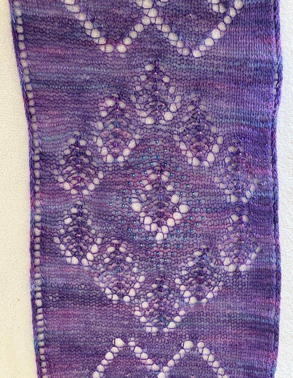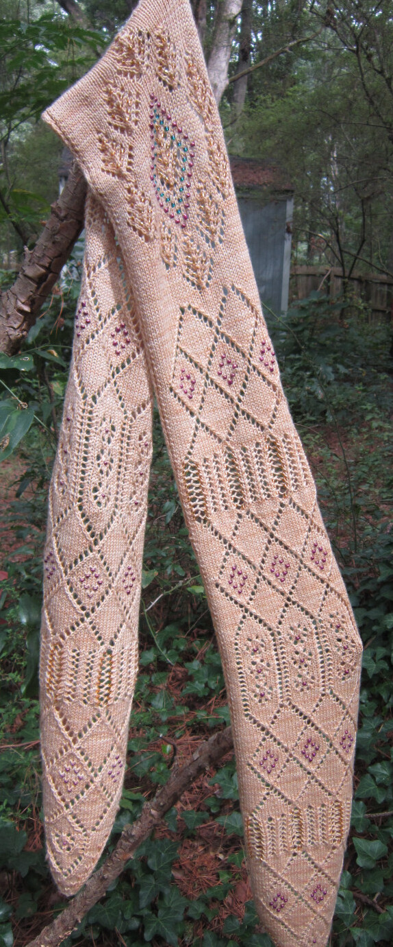 The yardage requirements will depend on if you knit the scarf without any embellishment (beads or Nupps) or if you use beads throughout. For that scenario, you will need 550 yards of fingering weight yarn. If you are a fan of Nupps and use those instead of beads, you will need 700 yards of fingering weight yarn (Like dragons, Nupps have voracious appetites.)