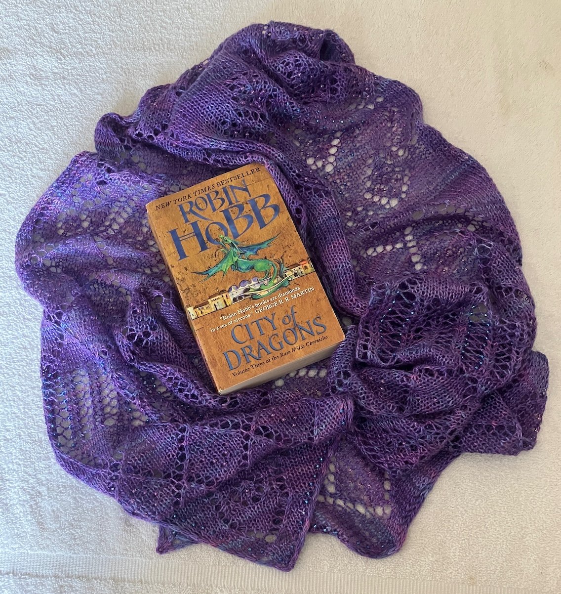 This year’s Banned Book Week project celebrates dragons with a scarf with long, pointed tails, plenty of scales, and shiny beads galore. The name comes from Kelsingra, the city of dragons, in Robin Hobb’s Rain Wild Chronicles (4 books in the Realm of the Elderlings 16 book series). Kelsingra, the city of dragons and their Elderlings, is full of light. From the globes along hallways, the jidzin strips that light your path with just a touch, or the windows that get larger the higher you climb until you reach the magnificent windows that give a panoramic view of the city from the Map Tower, Kelsingra is a city of lights that shine on the gem-like hides of dragons.