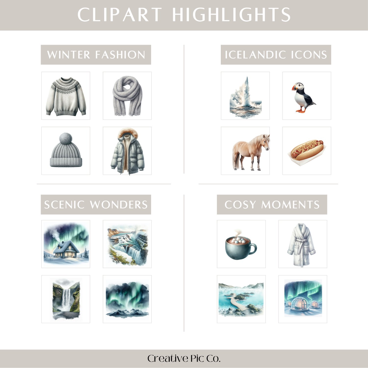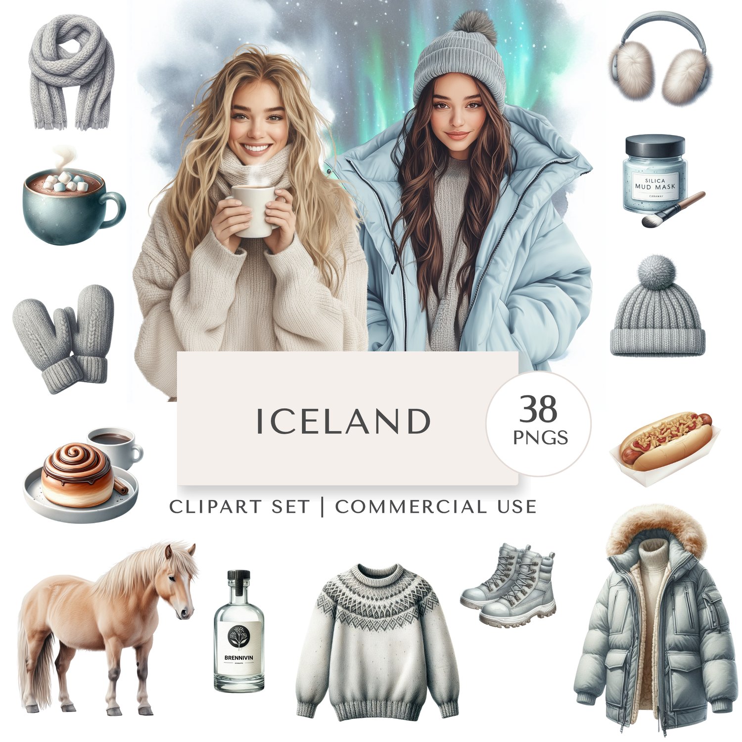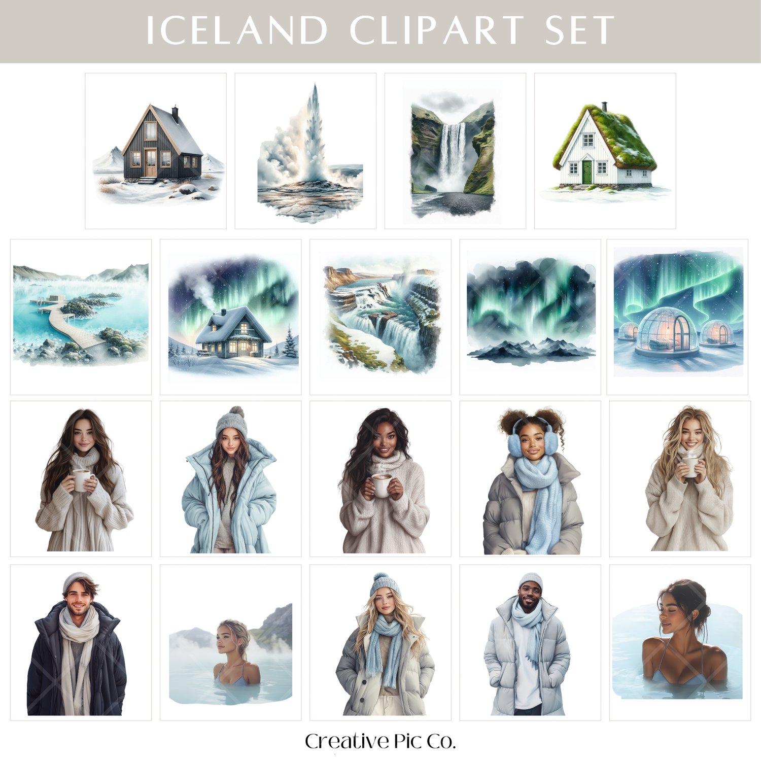 Capture the magic of the North with this Iceland Clipart Set, featuring 38 watercolour-style PNGs inspired by Nordic winters and Icelandic charm. From puffins, hot springs, geysers, waterfalls, and turf houses to cosy parkas, boots, and steaming mugs, this collection brings the essence of Iceland to your creative projects.