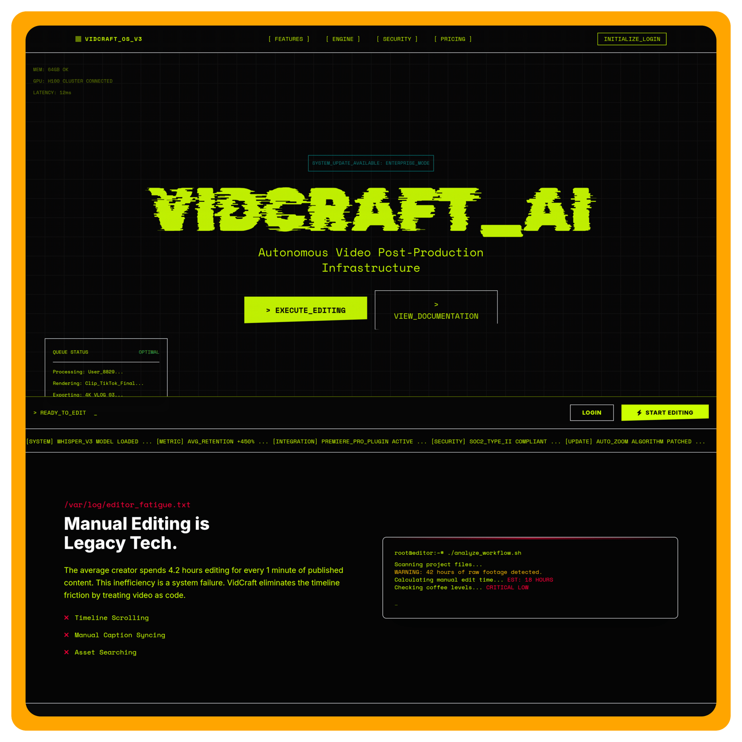 VidCraft AI is a high-impact, terminal-themed landing page template built for AI video editors, SaaS tools, creator platforms, or automation products. With brutalist visuals, glitch effects, and a cinematic OS-style layout, this template helps you sell your video automation tool like a futuristic editing engine.