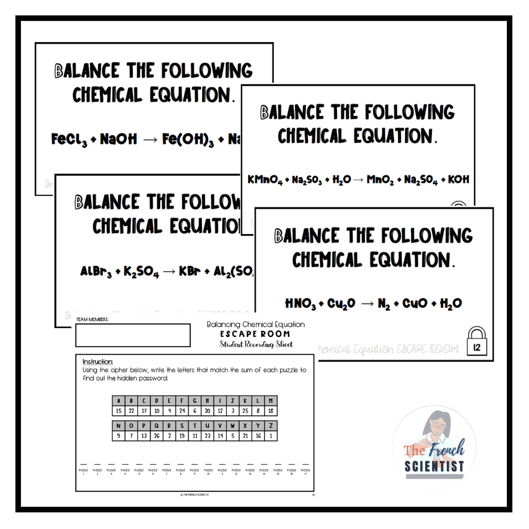 CHEMISTRY Balancing Chemical Equation Escape Room Activity is a great resource intended to reinforce students' understanding of the topic of balancing chemical equations as a part of the warm-up, review tasks, or end-of-year activities.