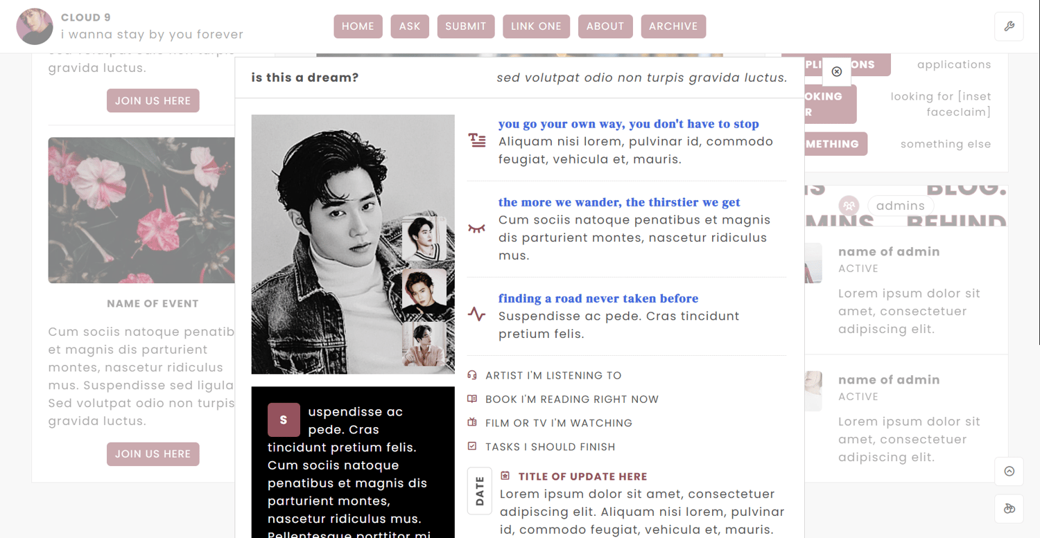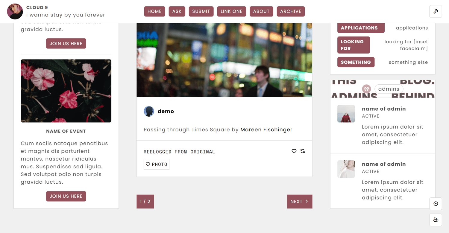 features: 100% x 250px header image, 45x45px icon image, blog title, blog subtitle, nine custom links, 258x250px sidebar image, 60x60px (another) icon image, search bar, two default events: 258x180px event image, event details, event links, site status section, admins section, modal title, modal subtitle, 250x320px about image, three 55x55px about icon image, text sections with icons, short updates section, updates section, 450px to 540px text posts